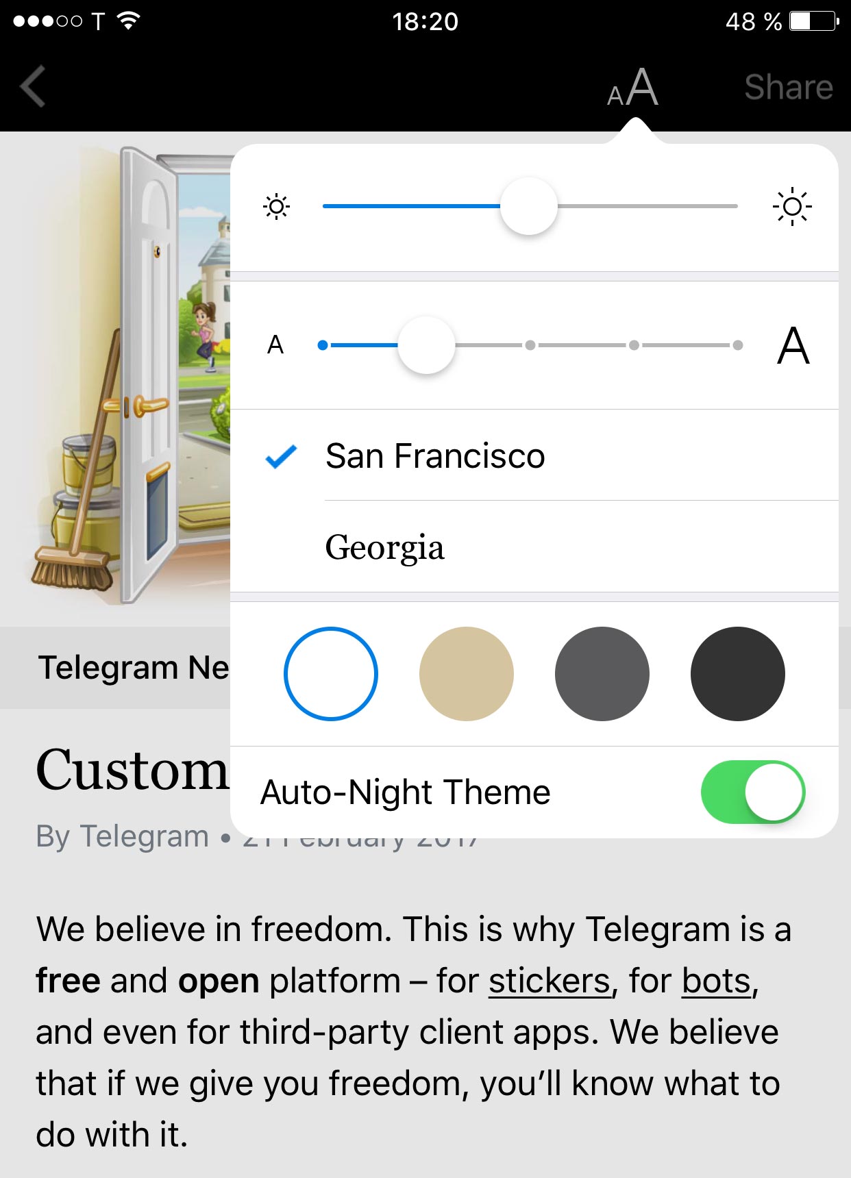 In version 4.0 we‘ve added some nifty Instant View settings. You can now view your articles in dark, gray, or sepia-toned environments, as well as adjust the font type and size. The Auto-Night Theme setting will soothe your eyes by automatically showing dark pages when it’s late.