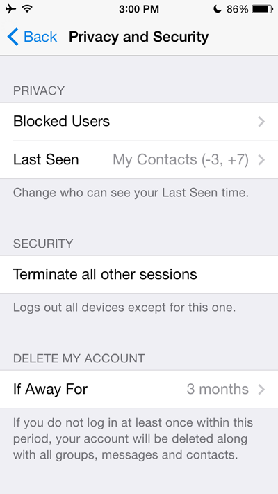 Starting today, you can specify exactly who will see your Last Seen time in both our iOS and Android apps. You can choose between the three basic options (“Everybody”, “My Contacts” and “Nobody”) and add any number of exceptions into the “Always Share With…” and “Never Share With…” sections.