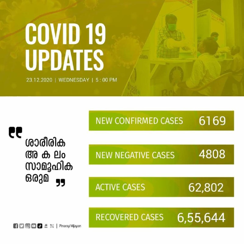 സംസ്ഥാനത്ത് ഇന്ന് 6169 പേര്ക്ക് കോവിഡ്-19 സ്ഥിരീകരിച്ചു. എറണാകുളം 953, കോട്ടയം 642, കോഴിക്കോട് 605, തൃശൂര് 564, മലപ്പുറം 500, കൊല്ലം 499, ആലപ്പുഴ 431, പത്തനംതിട്ട 406, തിരുവനന്തപുരം 404, പാലക്കാട് 367, വയനാട് 260, ഇടുക്കി 242, കണ്ണൂര് 228, കാസര്ഗോഡ് 68 എന്നിങ്ങനേയാണ് ജില്ലകളില് ഇന്ന് രോഗ ബാധ സ്ഥിരീകരിച്ചത്.