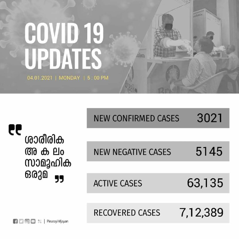 സംസ്ഥാനത്ത് ഇന്ന് 3021 പേര്ക്ക് കോവിഡ്-19 സ്ഥിരീകരിച്ചു. കോഴിക്കോട് 481, മലപ്പുറം 406, എറണാകുളം 382, തൃശൂര് 281, കോട്ടയം 263, ആലപ്പുഴ 230, തിരുവനന്തപുരം 222, കൊല്ലം 183, പാലക്കാട് 135, കണ്ണൂര് 133, പത്തനംതിട്ട 110, ഇടുക്കി 89, വയനാട് 79, കാസര്ഗോഡ് 27 എന്നിങ്ങനേയാണ് ജില്ലകളില് ഇന്ന് രോഗ ബാധ സ്ഥിരീകരിച്ചത്.