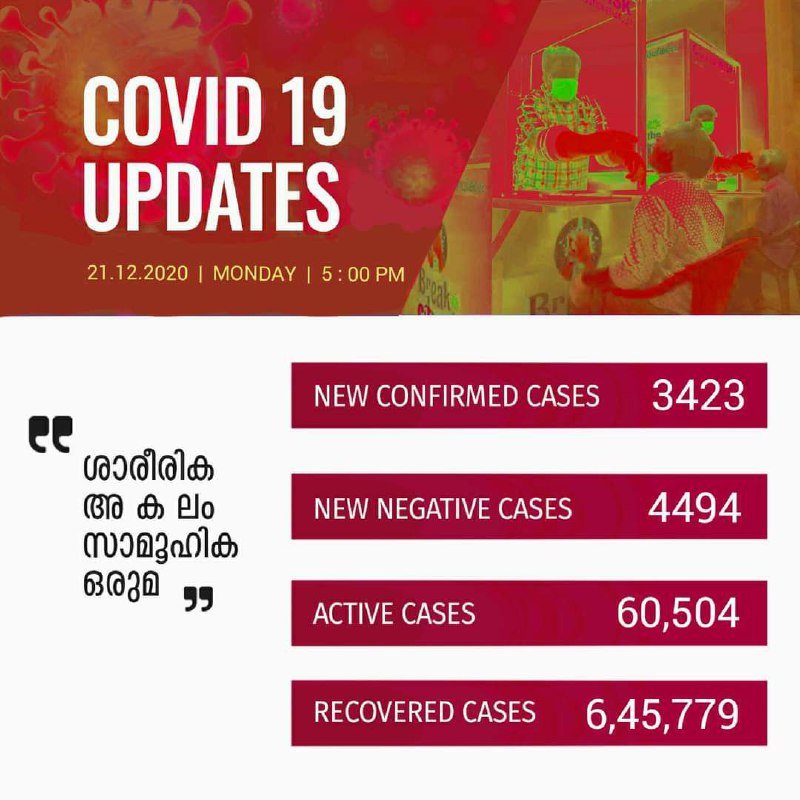 സംസ്ഥാനത്ത് ഇന്ന് 3423 പേര്ക്ക് കോവിഡ്-19 സ്ഥിരീകരിച്ചു. മലപ്പുറം 626, കോഴിക്കോട് 507, എറണാകുളം 377, പാലക്കാട് 305, തൃശൂര് 259, ആലപ്പുഴ 242, കൊല്ലം 234, തിരുവനന്തപുരം 222, കോട്ടയം 217, കണ്ണൂര് 159, പത്തനംതിട്ട 112, വയനാട് 65, ഇടുക്കി 55, കാസര്ഗോഡ് 43 എന്നിങ്ങനേയാണ് ജില്ലകളില് ഇന്ന് രോഗ ബാധ സ്ഥിരീകരിച്ചത്.