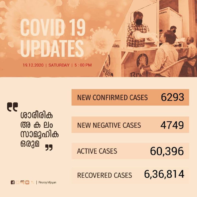 സംസ്ഥാനത്ത് ഇന്ന് 6293 പേര്ക്ക് കോവിഡ്-19 സ്ഥിരീകരിച്ചു. എറണാകുളം 826, കോഴിക്കോട് 777, മലപ്പുറം 657, തൃശൂര് 656, കോട്ടയം 578, ആലപ്പുഴ 465, കൊല്ലം 409, പാലക്കാട് 390, പത്തനംതിട്ട 375, തിരുവനന്തപുരം 363, കണ്ണൂര് 268, വയനാട് 239, ഇടുക്കി 171, കാസര്ഗോഡ് 119 എന്നിങ്ങനേയാണ് ജില്ലകളില് ഇന്ന് രോഗ ബാധ സ്ഥിരീകരിച്ചത്.