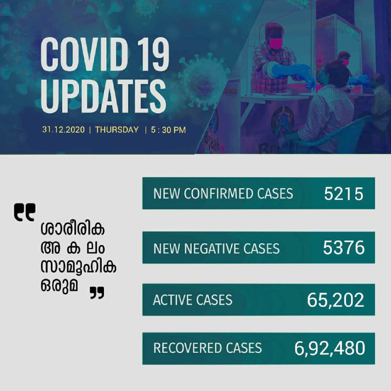 സംസ്ഥാനത്ത് ഇന്ന് 5215 പേര്ക്ക് കോവിഡ്-19 സ്ഥിരീകരിച്ചു. എറണാകുളം 574, കോഴിക്കോട് 520, തൃശൂര് 515, പത്തനംതിട്ട 512, കോട്ടയം 481, ആലപ്പുഴ 425, തിരുവനന്തപുരം 420, കൊല്ലം 402, മലപ്പുറം 388, കണ്ണൂര് 302, പാലക്കാട് 225, ഇടുക്കി 190, വയനാട് 165, കാസര്ഗോഡ് 96 എന്നിങ്ങനേയാണ് ജില്ലകളില് ഇന്ന് രോഗ ബാധ സ്ഥിരീകരിച്ചത്.