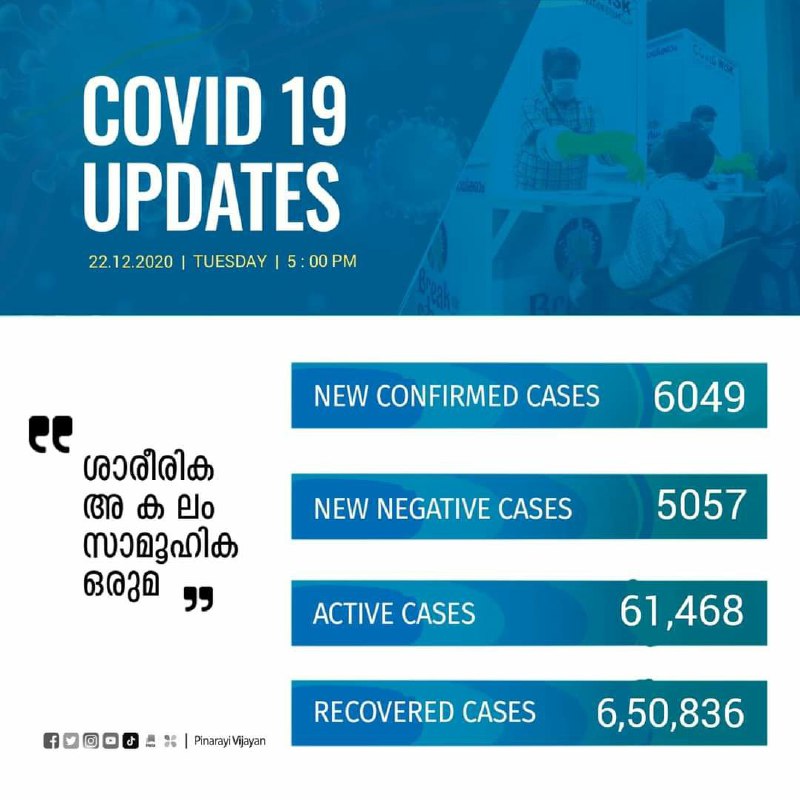 സംസ്ഥാനത്ത് ഇന്ന് 6049 പേര്ക്ക് കോവിഡ്-19 സ്ഥിരീകരിച്ചു. കോട്ടയം 760, തൃശൂര് 747, എറണാകുളം 686, കോഴിക്കോട് 598, മലപ്പുറം 565, പത്തനംതിട്ട 546, കൊല്ലം 498, തിരുവനന്തപുരം 333, ആലപ്പുഴ 329, പാലക്കാട് 303, കണ്ണൂര് 302, വയനാട് 202, ഇടുക്കി 108, കാസര്ഗോഡ് 72 എന്നിങ്ങനേയാണ് ജില്ലകളില് ഇന്ന് രോഗ ബാധ സ്ഥിരീകരിച്ചത്.