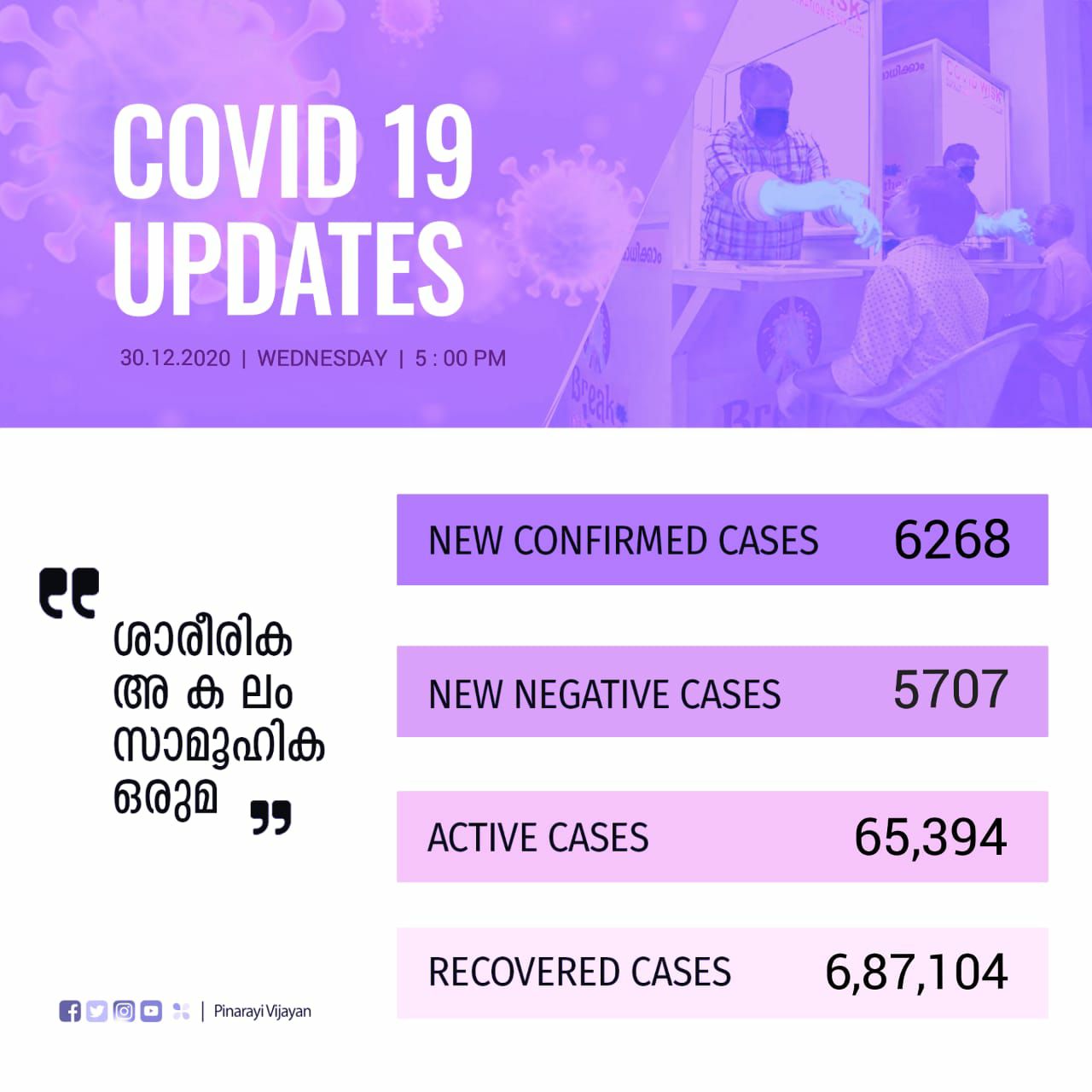 സംസ്ഥാനത്ത് 6268 ഇന്ന് പേര്ക്ക് കോവിഡ്-19 സ്ഥിരീകരിച്ചു. എറണാകുളം 1006, പത്തനംതിട്ട 714, കോഴിക്കോട് 638, കൊല്ലം 602, കോട്ടയം 542, ആലപ്പുഴ 463, തൃശൂര് 450, മലപ്പുറം 407, പാലക്കാട് 338, തിരുവനന്തപുരം 320, വയനാട് 267, കണ്ണൂര് 242, ഇടുക്കി 204, കാസര്ഗോഡ് 75 എന്നിങ്ങനേയാണ് ജില്ലകളില് ഇന്ന് രോഗ ബാധ സ്ഥിരീകരിച്ചത്.