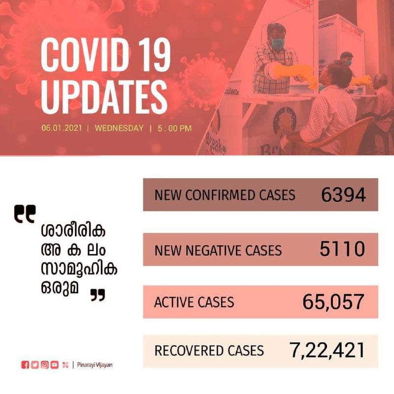 സംസ്ഥാനത്ത് ഇന്ന് 6394 പേര്ക്ക് കോവിഡ്-19 സ്ഥിരീകരിച്ചു. എറണാകുളം 1068, കോഴിക്കോട് 729, പത്തനംതിട്ട 666, കോട്ടയം 555, കൊല്ലം 548, തൃശൂര് 502, ആലപ്പുഴ 446, മലപ്പുറം 432, തിരുവനന്തപുരം 416, ഇടുക്കി 271, പാലക്കാട് 255, കണ്ണൂര് 219, വയനാട് 210, കാസര്ഗോഡ് 77 എന്നിങ്ങനേയാണ് ജില്ലകളില് ഇന്ന് രോഗ ബാധ സ്ഥിരീകരിച്ചത്.