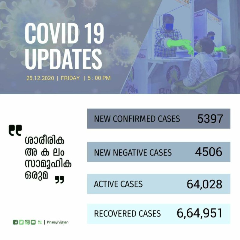ഇന്ന് രോഗം സ്ഥിരീകരിച്ചവരില് 122 പേര് സംസ്ഥാനത്തിന് പുറത്ത് നിന്നും വന്നവരാണ്. 4621 പേര്ക്ക് സമ്പര്ക്കത്തിലൂടെയാണ് രോഗം ബാധിച്ചത്. 405 പേരുടെ സമ്പര്ക്ക ഉറവിടം വ്യക്തമല്ല. എറണാകുളം 528, കോഴിക്കോട് 474, തൃശൂര് 501, പത്തനംതിട്ട 423, കോട്ടയം 459, ആലപ്പുഴ 412, തിരുവനന്തപുരം 296, കൊല്ലം 398, മലപ്പുറം 359, കണ്ണൂര് 245, പാലക്കാട് 111, ഇടുക്കി 177, വയനാട് 154, കാസര്ഗോഡ് 84 എന്നിങ്ങനേയാണ് സമ്പര്ക്കത്തിലൂടെ രോഗം ബാധിച്ചത്.