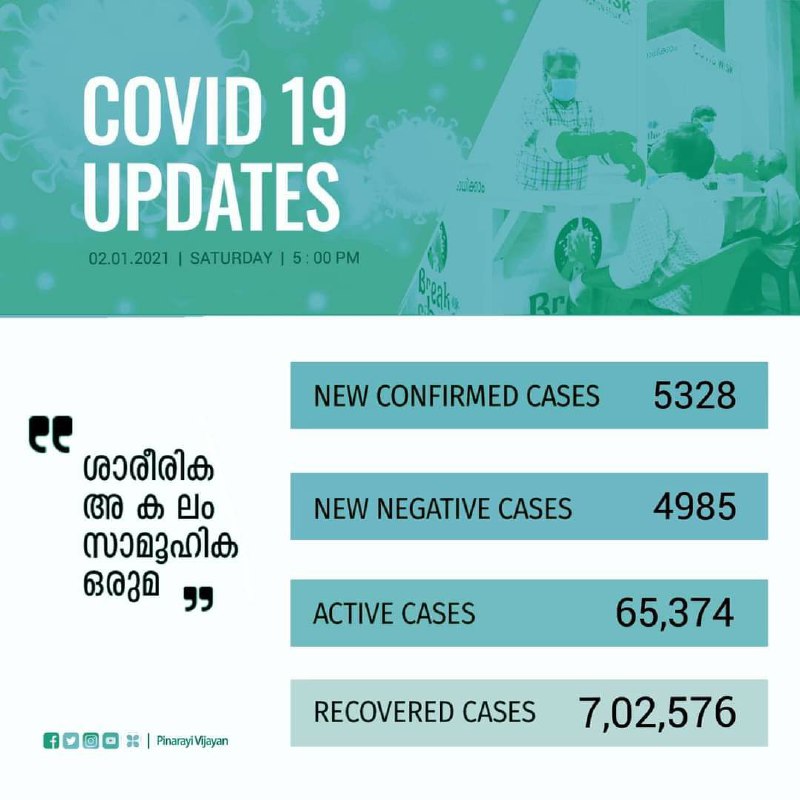 സംസ്ഥാനത്ത് ഇന്ന് 5328 പേര്ക്ക് കോവിഡ്-19 സ്ഥിരീകരിച്ചു. എറണാകുളം 743, കോഴിക്കോട് 596, മലപ്പുറം 580, കോട്ടയം 540, പത്തനംതിട്ട 452, തൃശൂര് 414, കൊല്ലം 384, ആലപ്പുഴ 382, തിരുവനന്തപുരം 290, പാലക്കാട് 240, ഇടുക്കി 223, വയനാട് 204, കണ്ണൂര് 197, കാസര്ഗോഡ് 83 എന്നിങ്ങനേയാണ് ജില്ലകളില് ഇന്ന് രോഗ ബാധ സ്ഥിരീകരിച്ചത്.