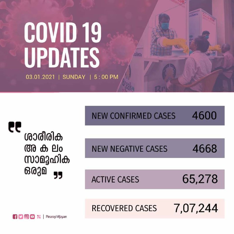 സംസ്ഥാനത്ത് ഇന്ന് 4600 പേര്ക്ക് കോവിഡ്-19 സ്ഥിരീകരിച്ചു. എറണാകുളം 728, മലപ്പുറം 522, കോഴിക്കോട് 511, കോട്ടയം 408, പത്തനംതിട്ട 385, തൃശൂര് 328, കൊല്ലം 327, തിരുവനന്തപുരം 282, ആലപ്പുഴ 270, ഇടുക്കി 253, പാലക്കാട് 218, കണ്ണൂര് 179, വയനാട് 148, കാസര്ഗോഡ് 41 എന്നിങ്ങനേയാണ് ജില്ലകളില് ഇന്ന് രോഗ ബാധ സ്ഥിരീകരിച്ചത്.