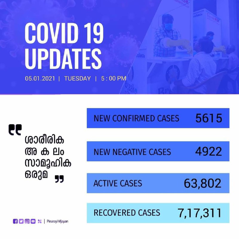 സംസ്ഥാനത്ത് ഇന്ന് 5615 പേര്ക്ക് കോവിഡ്-19 സ്ഥിരീകരിച്ചു. എറണാകുളം 719, കോട്ടയം 715, പത്തനംതിട്ട 665, തൃശൂര് 616, കൊല്ലം 435, കോഴിക്കോട് 426, ആലപ്പുഴ 391, തിരുവനന്തപുരം 388, മലപ്പുറം 385, പാലക്കാട് 259, കണ്ണൂര് 252, വയനാട് 175, ഇടുക്കി 131, കാസര്ഗോഡ് 58 എന്നിങ്ങനേയാണ് ജില്ലകളില് ഇന്ന് രോഗ ബാധ സ്ഥിരീകരിച്ചത്.