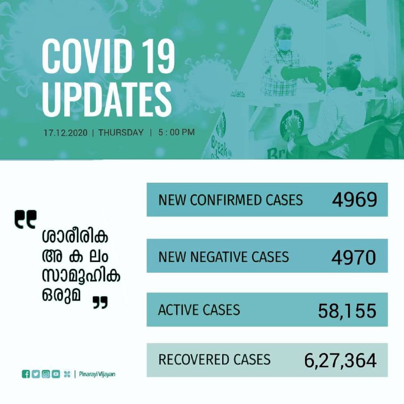 സംസ്ഥാനത്ത് ഇന്ന് 4969 പേര്ക്ക് കോവിഡ്-19 സ്ഥിരീകരിച്ചു. കോഴിക്കോട് 585, മലപ്പുറം 515, കോട്ടയം 505, എറണാകുളം 481, തൃശൂര് 457, പത്തനംതിട്ട 432, കൊല്ലം 346, ആലപ്പുഴ 330, പാലക്കാട് 306, തിരുവനന്തപുരം 271, കണ്ണൂര് 266, ഇടുക്കി 243, വയനാട് 140, കാസര്ഗോഡ് 92 എന്നിങ്ങനേയാണ് ജില്ലകളില് ഇന്ന് രോഗ ബാധ സ്ഥിരീകരിച്ചത്.