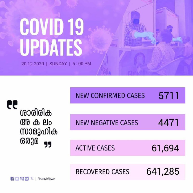 സംസ്ഥാനത്ത് ഇന്ന് 5711 പേര്ക്ക് കോവിഡ്-19 സ്ഥിരീകരിച്ചു. കോട്ടയം 905, മലപ്പുറം 662, കോഴിക്കോട് 650, എറണാകുളം 591, കൊല്ലം 484, തൃശൂര് 408, പത്തനംതിട്ട 360, തിരുവനന്തപുരം 333, കണ്ണൂര് 292, ആലപ്പുഴ 254, പാലക്കാട് 247, ഇടുക്കി 225, വയനാട് 206, കാസര്ഗോഡ് 94 എന്നിങ്ങനേയാണ് ജില്ലകളില് ഇന്ന് രോഗ ബാധ സ്ഥിരീകരിച്ചത്.