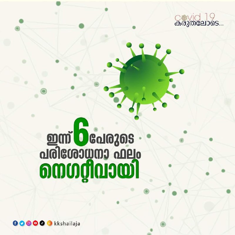 ഇന്ന് 6 പേരുടെ പരിശോധനാ ഫലം നെഗറ്റീവായി. ഇറ്റലിയില് നിന്നും വന്ന് എറണാകുളം കളമശേരി മെഡിക്കല് കോളേജില് ചികിത്സയില് കഴിയുന്ന മൂന്ന് വയസുള്ള കുട്ടി ഉള്പ്പെടെയുള്ള കുടുംബത്തിന്റേയും അവിടെത്തന്നെ ചികിത്സയിലുള്ള മറ്റ് രണ്ട് വിദേശികളുടേയും ഇറ്റലിയില് നിന്നും വന്ന പത്തനംതിട്ട സ്വദേശിയുടേയും പരിശോധനാ ഫലവുമാണ് നെഗറ്റീവായത്. ഇവരെ ഡിസ്ചാര്ജ് ചെയ്തിട്ടില്ല.