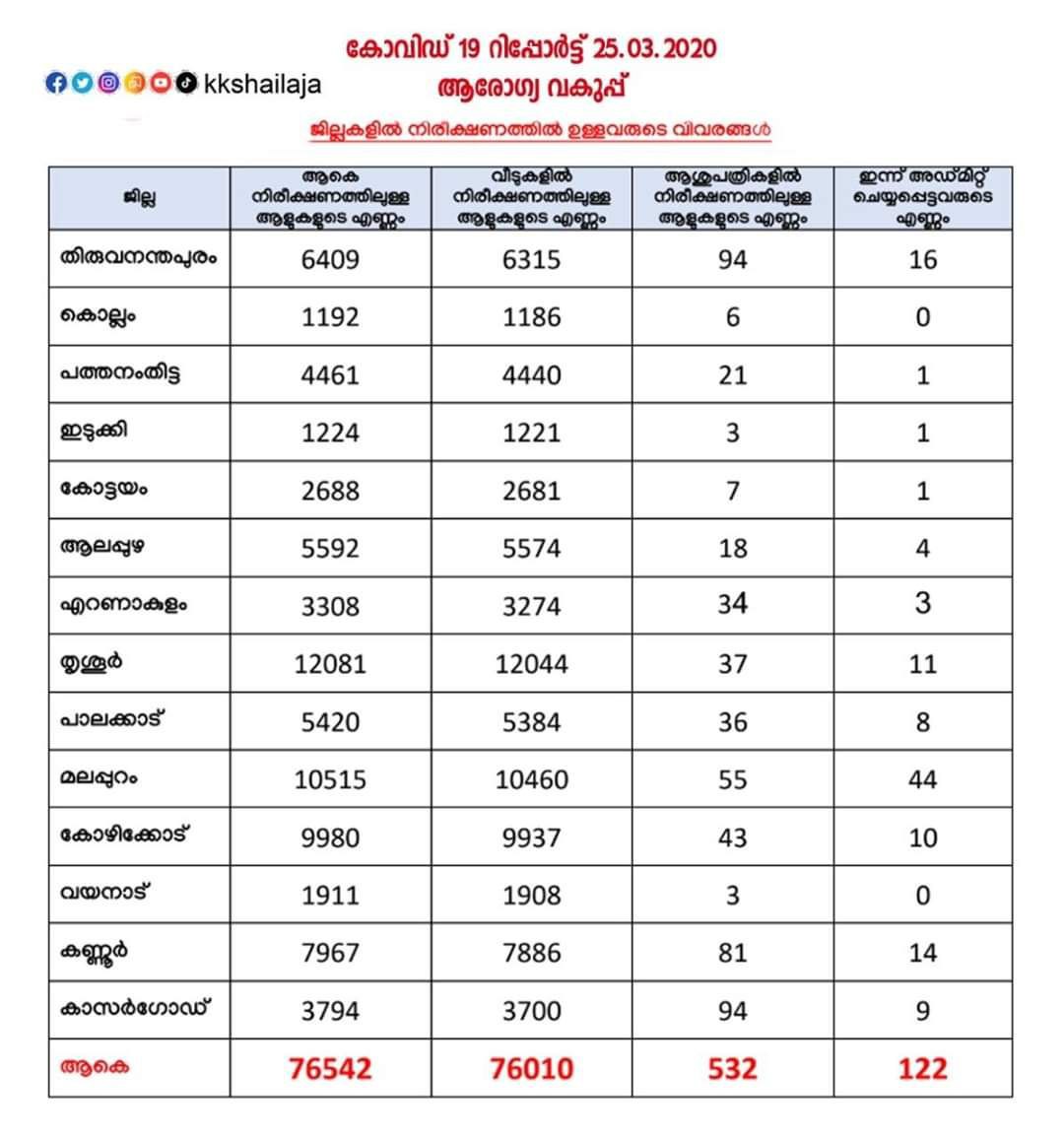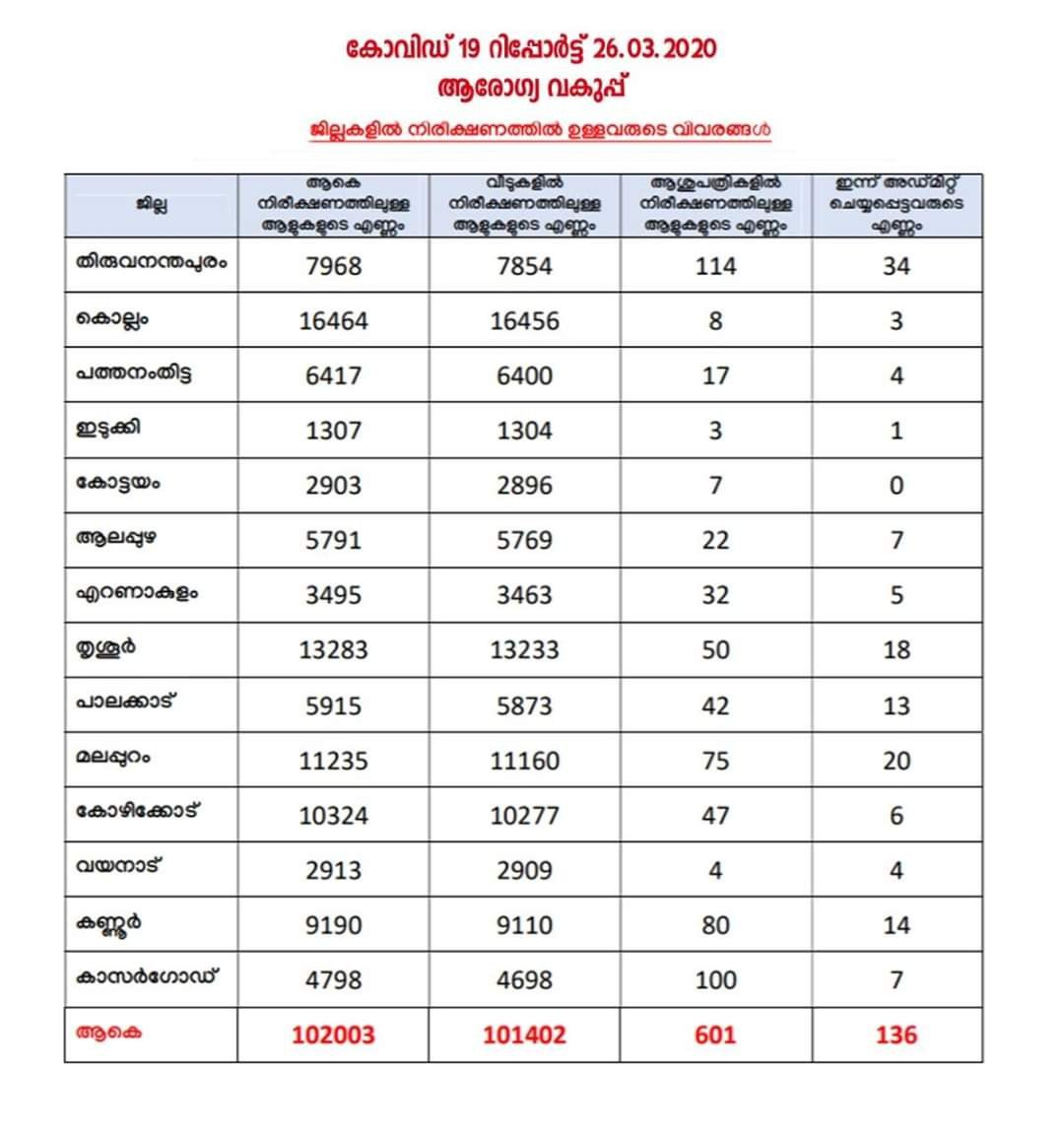 ആകെ ഒരുലക്ഷത്തി ഇരുപതിനായിരത്തി മൂന്ന് ആളുകളാണ് ഇപ്പോള് നിരീക്ഷണത്തിലുള്ളത്. അതില് ഒരുലക്ഷത്തി ആയിരത്തി നാനൂറ്റി രണ്ടു പേര് വീടുകളിലും 601 പേര് ആശുപത്രികളിലുമാണ്. ഇന്നു മാത്രം 136 പേരെ ആശുപത്രിയില് പ്രവേശിപ്പിച്ചു. 5342 സാമ്പിളുകളാണ് പരിശോധനയ്ക്ക് അയച്ചത്. 3768 എണ്ണം രോഗബാധ ഇല്ല എന്നുറപ്പാക്കിയിട്ടുണ്ട്.