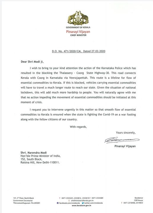 തലശ്ശേരി കൂർഗ് പാതയിലെ കർണാടക അതിർത്തി അടച്ച നടപടി ഒഴിവാക്കാൻ ഇടപെടണം എന്നാവശ്യപ്പെട്ട് മുഖ്യമന്ത്രി പിണറായി വിജയൻ പ്രധാനമന്ത്രിക്ക് കത്തയച്ചു. കേരളത്തിലേക്കുള്ള ചരക്കുനീക്കത്തിന്റെ പ്രധാനപ്പെട്ട പാതയാണിത്. ദേശീയവ്യാപകമായി ലോക്ക്ഡൌൺ പ്രഖ്യാപിച്ചതോടുകൂടി കേരളത്തിൽ ഭക്ഷണസാധനങ്ങൾക്ക് ക്ഷാമം ഉണ്ടാകാതിരിക്കാനുള്ള നടപടികൾ സംസ്ഥാനസർക്കാർ സ്വീകരിക്കുന്നുണ്ട്. അവശ്യസാധനങ്ങളുടെ ചരക്കുനീക്കം സ്തംഭിപ്പിക്കില്ലെന്ന് പ്രധാനമന്ത്രി തന്നെ ഉറപ്പുനൽകിയ കാര്യവും മുഖ്യമന്ത്രി കത്തിൽ ചൂണ്ടിക്കാട്ടി. അതുകൊണ്ട് അടിയന്തിരമായി ഈ കാര്യത്തിൽ ഇടപെടുകയും കർണാടകയിൽ നിന്ന് കേരളത്തിലേക്ക് ചരക്കുനീക്കത്തിനുള്ള സാഹചര്യം ഉണ്ടാക്കുകയും ചെയ്യണമെന്ന് പ്രധാനമന്ത്രിയോട് മുഖ്യമന്ത്രി ആവശ്യപ്പെട്ടു.