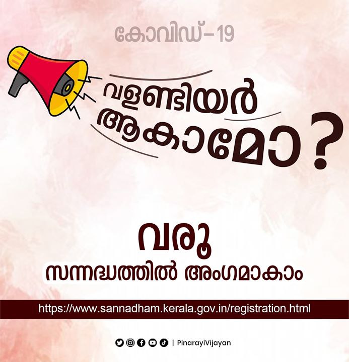 സംസ്ഥാനത്ത് കോവിഡ് -19 പ്രതിരോധ പ്രവർത്തനങ്ങൾക്കായി സന്നദ്ധ പ്രവർത്തകരെ നിയോഗിക്കാൻ തീരുമാനിച്ചിരുന്നു. 22 വയസിനും 40 വയസിനും ഇടയിൽ പ്രായമുള്ളവരെ ഉൾപ്പെടുത്തി 2, 36,000 പേരുൾപ്പെടുന്ന സന്നദ്ധ സേനക്ക് രൂപം നൽകാനാണ് തീരുമാനിച്ചത്. ഭക്ഷണവും ഭക്ഷ്യവസ്തുക്കളും എത്തിക്കൽ, മറ്റു സംവിധാനങ്ങൾക്ക് കണ്ടെത്താൻ കഴിയാത്തവരെ ആശുപത്രിയിൽ എത്തിക്കുക, ആവശ്യമെങ്കിൽ ആശുപത്രിയിൽ കൂട്ടിരിക്കുക തുടങ്ങിയ ആവശ്യങ്ങൾക്കായാണ് സന്നദ്ധ സേന രൂപീകരിക്കുന്നത്. സന്നദ്ധം വെബ്പോർട്ടൽ വഴി ഓൺലൈനായി പേര് രജിസ്റ്റർ ചെയ്യാം.