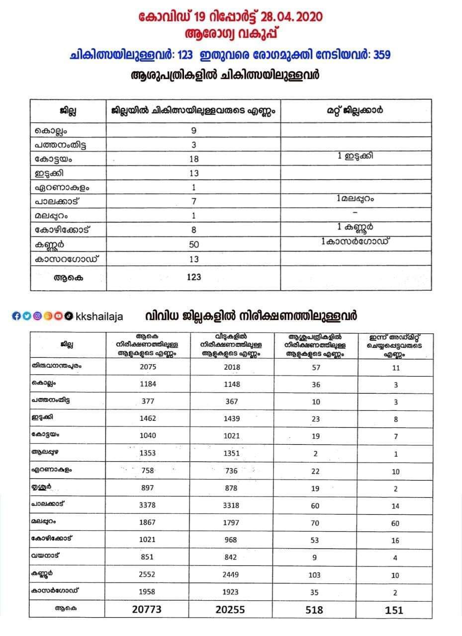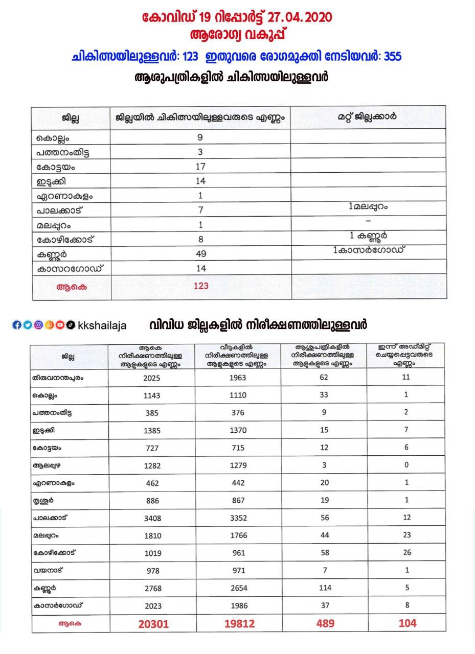 സംസ്ഥാനത്തെ വിവിധ ജില്ലകളിലായി 20,301 പേര് നിരീക്ഷണത്തിലാണ്. ഇവരില് 19,812 പേര് വീടുകളിലും 489 പേര് ആശുപത്രികളിലും നിരീക്ഷണത്തിലാണ്. 104 പേരെയാണ് ഇന്ന് ആശുപത്രിയില് പ്രവേശിപ്പിച്ചത്. രോഗലക്ഷണങ്ങള് ഉള്ള 23,271 വ്യക്തികളുടെ സാമ്പിള് പരിശോധനയ്ക്ക് അയച്ചിട്ടുണ്ട്. ഇതില് ലഭ്യമായ 22,537 സാമ്പിളുകളുടെ പരിശോധനാഫലം നെഗറ്റിവ് ആണ്. സെന്റിനല് സര്വയലന്സിന്റെ ഭാഗമായി ആരോഗ്യ പ്രവര്ത്തകര്, അതിഥി തൊഴിലാളികള്, സാമൂഹിക സമ്പര്ക്കം കൂടുതലുള്ള വ്യക്തികള് തുടങ്ങിയ മുന്ഗണനാ ഗ്രൂപ്പില് നിന്ന് 875 സാമ്പിളുകള് ശേഖരിച്ചതില് ലഭ്യമായ 611 സാമ്പിളുകള് നെഗറ്റീവായി. സമൂഹത്തില് കോവിഡ് പരിശോധന ഊര്ജിതമാക്കുന്നതിന്റെ ഭാഗമായി ഏപ്രില് 26ന് 3056 സാമ്പിളുകള് പരിശോധനയ്ക്കയച്ചു.