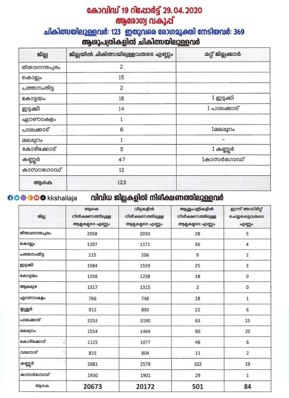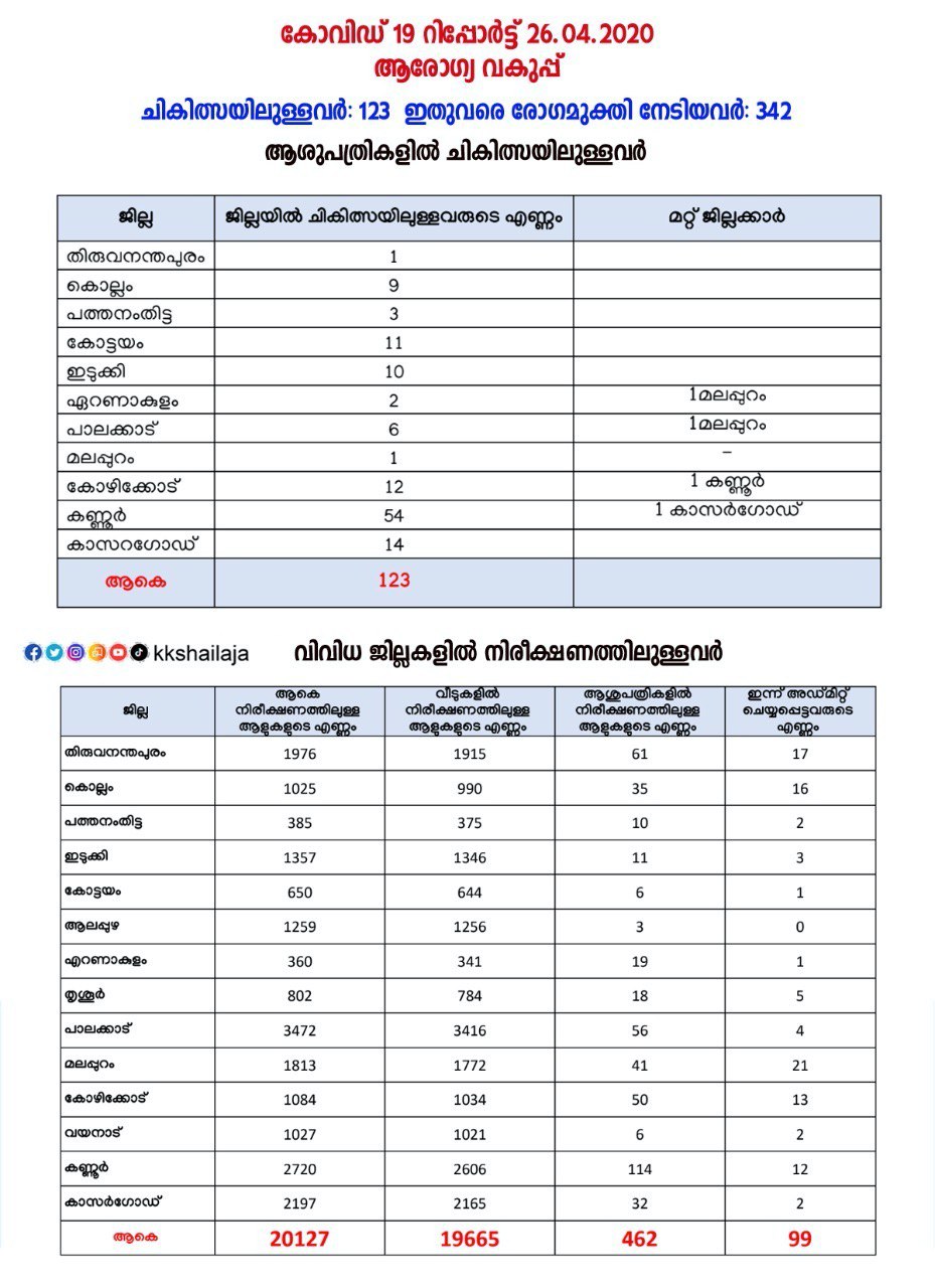 4 പേര് രോഗമുക്തി നേടി; ഇനി ചികിത്സയിലുള്ളത് 123 പേര്; ഇതുവരെ രോഗമുക്തി നേടിയവര് 342