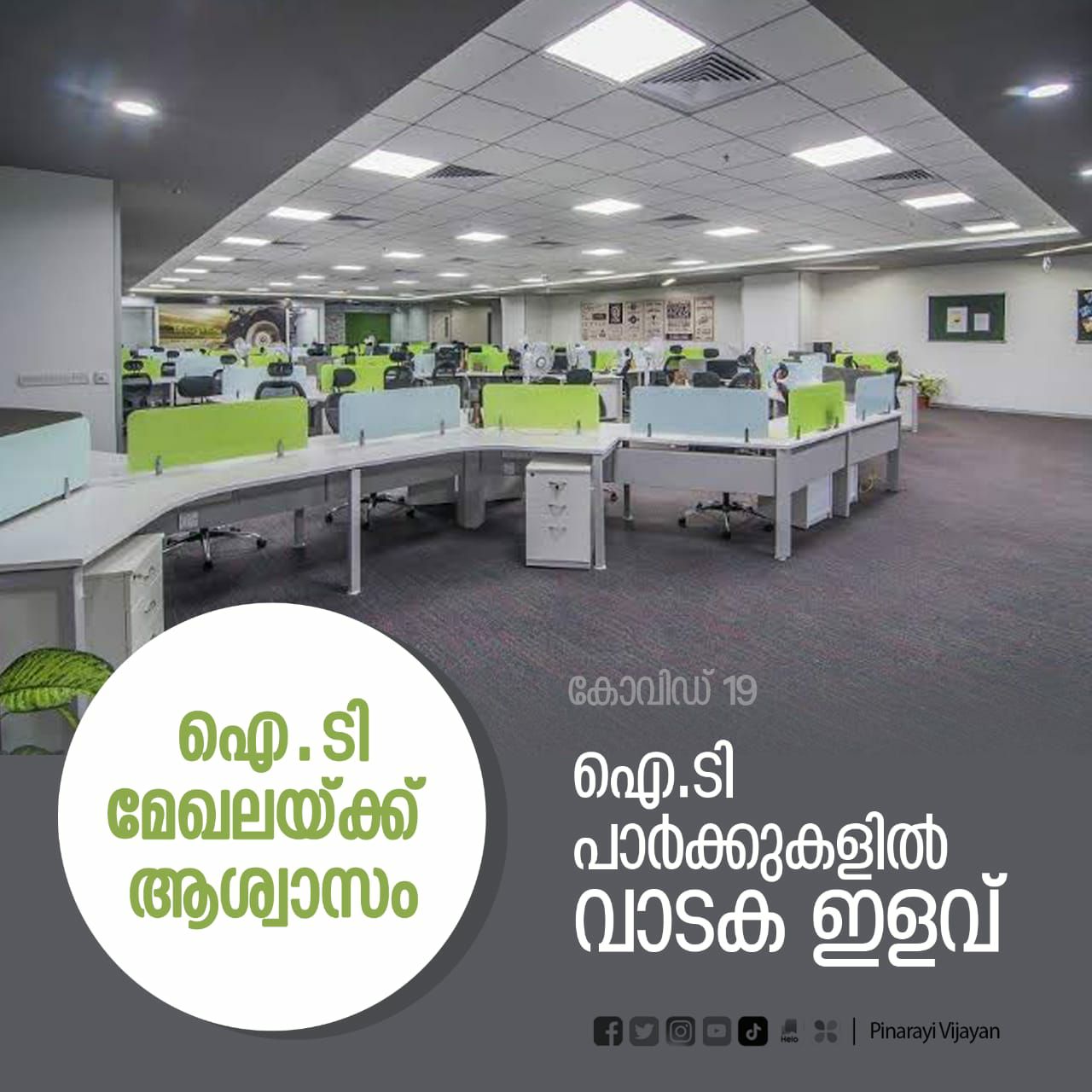 ഐടി പാർക്കുകളിലെ സർക്കാർ ബിൽഡിങ്ങുകളിൽ പ്രവർത്തിക്കുന്ന ഐടി /ഐടി ഇതര സ്ഥാപനങ്ങൾ വാർഷികമായി വാടകയിൽ വരുന്ന 5% വർദ്ധനവ് 2020-21 സാമ്പത്തിക വർഷം നൽകേണ്ടതില്ല.