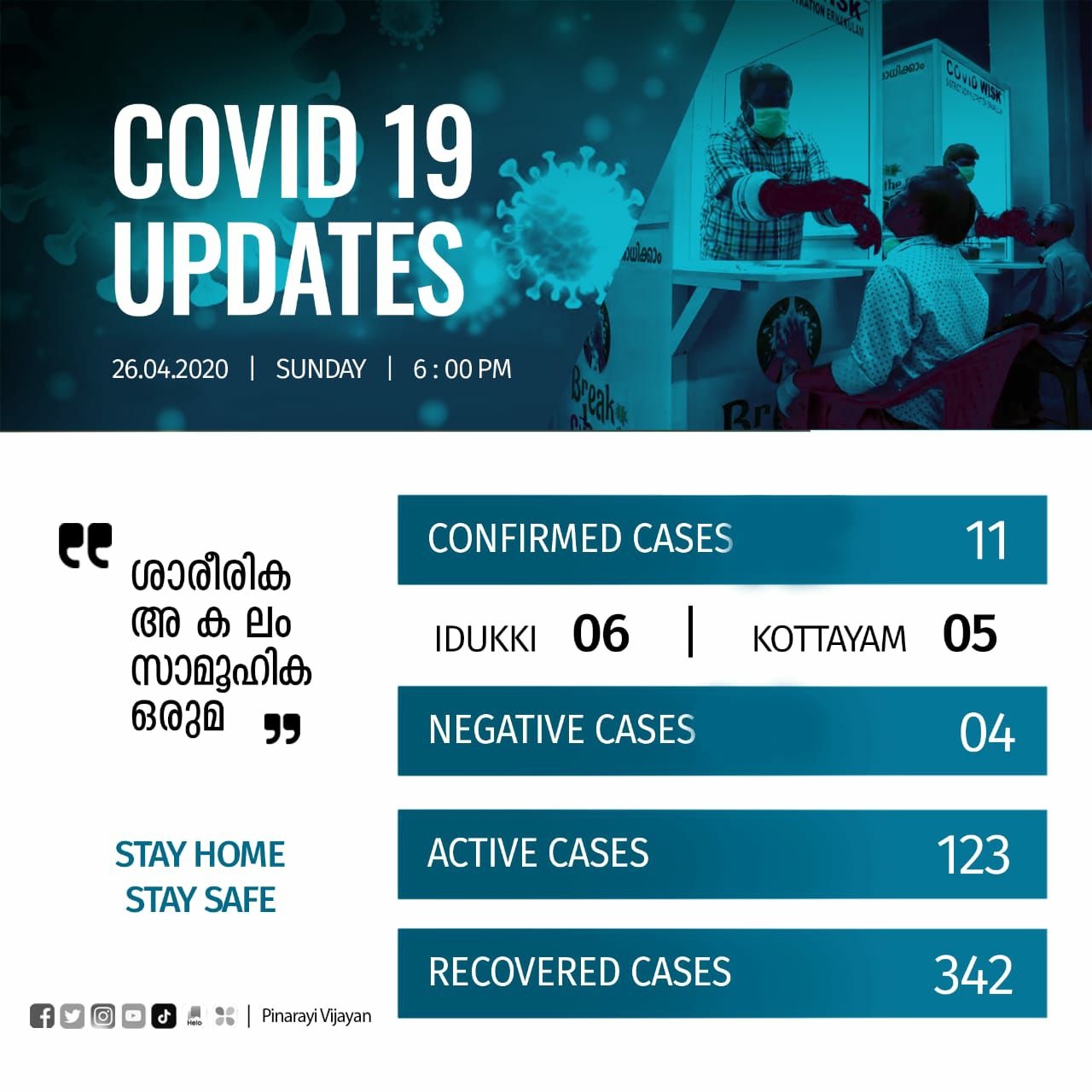 Thiruvananthapuram, April 26: Kerala Minister of Health & Social Justice, Smt K K Shailaja informed that 11 new cases of the Coronavirus infection were confirmed in the State today - six persons from Idukki district and five in Kottayam district. While one person has returned to Kerala from overseas, three have come back from neighbouring states and seven are cases of local transmission. This includes one Doctor in Idukki district and two healthcare workers in Kottayam district.