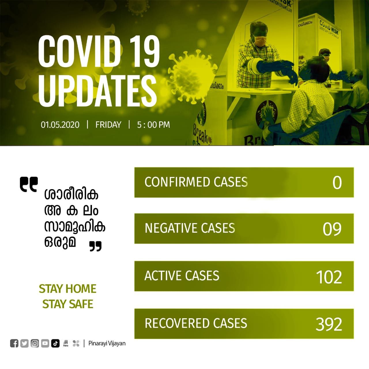 9 പേർ ഇന്ന് രോഗമുക്തരായി. കണ്ണൂര്, കാസര്ഗോഡ് ജില്ലകളില് നിന്നും 4 വീതവും എറണാകുളത്ത് ഒരാളുടെയും പരിശോധനാഫലമാണ് നെഗറ്റീവ് ആയത്. ഇതുവരെ 392 പേർ രോഗമുക്തരായി. 102 പേരാണ് വിവിധ ആശുപത്രികളില് ചികിത്സയിലുള്ളത്.