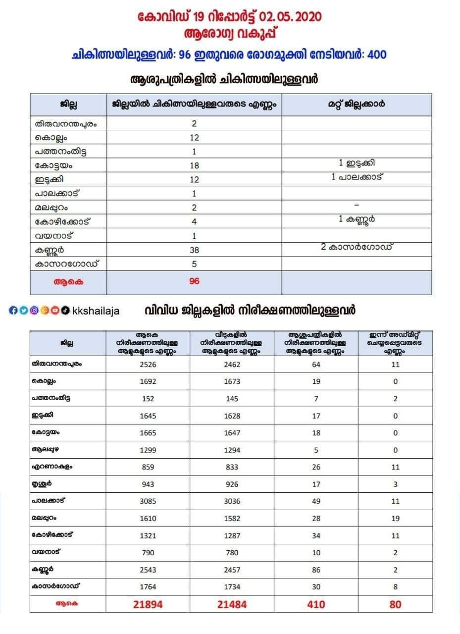 കഴിഞ്ഞ ദിവസം കോവിഡ് രോഗികള് ഇല്ലാത്തതിനാല് പുതിയ ഹോട്ട് സ്പോട്ടില്ല. ഇപ്പോള് 80 ഹോട്ട് സ്പോട്ടുകളാണുള്ളത്.