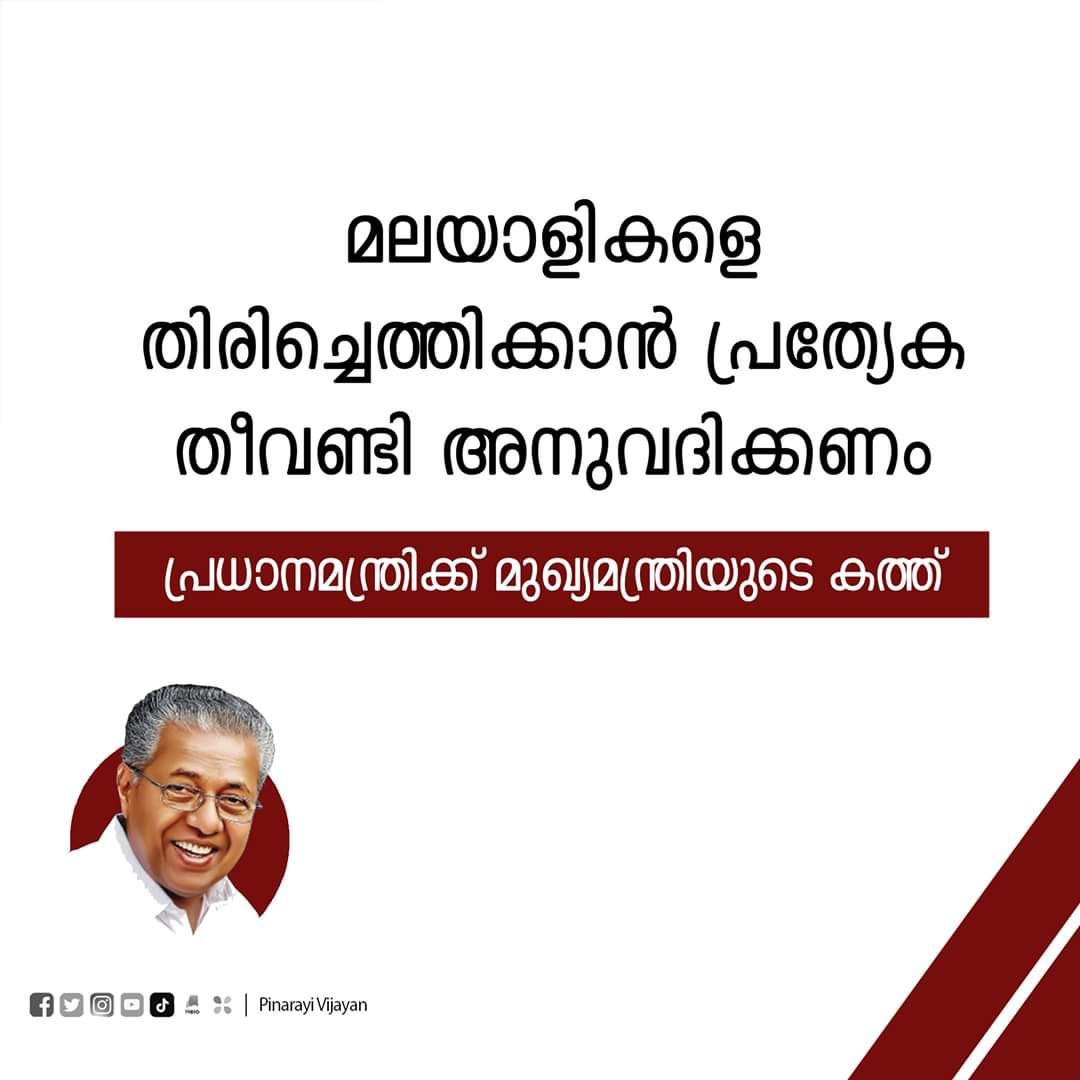 കേരളത്തിൽ നിന്ന് പുറത്തേക്ക് അതിഥി തൊഴിലാളികളെ കൊണ്ടുപോകുന്ന ട്രെയിനുകൾ മലയാളികളെ തിരിച്ചെത്തിക്കാൻ ഉപയുക്തമാക്കണമെന്നും ആവശ്യപ്പെട്ടു.