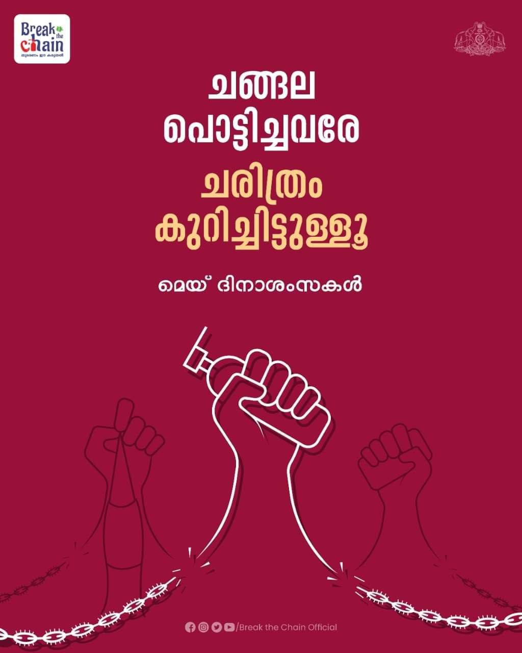 ഐതിഹാസികമായ തൊഴിലാളി പ്രക്ഷോഭങ്ങളുടെ ഓർമ്മയിൽ ലോകം ഇന്ന് മെയ്ദിനം ആചരിക്കുകയാണ്. മഹാമാരിയിൽ ലോകമെങ്ങും വിറങ്ങലിച്ചു നിൽക്കുമ്പോഴാണ് ഇത്തവണത്തെ മെയ്ദിനം. തൊഴിലാളി വർഗം അവരുടെ സാമൂഹിക കടമ ഏറ്റവും ഉയർന്ന നിലയിൽ നിർവ്വഹിക്കുന്ന ഘട്ടം. ഓരോ മേഖലയിലും തൊഴിലെടുക്കുന്നവർ തങ്ങളുടേതായ രീതിയിൽ ഈ കോവിഡ് - 19 നെ പിടിച്ചുകെട്ടാൻ വിശ്രമമില്ലാതെ പ്രയത്നിക്കുന്നു. അവർക്കെല്ലാം കേരളത്തിൻ്റെ ബിഗ് സല്യൂട്ട്.