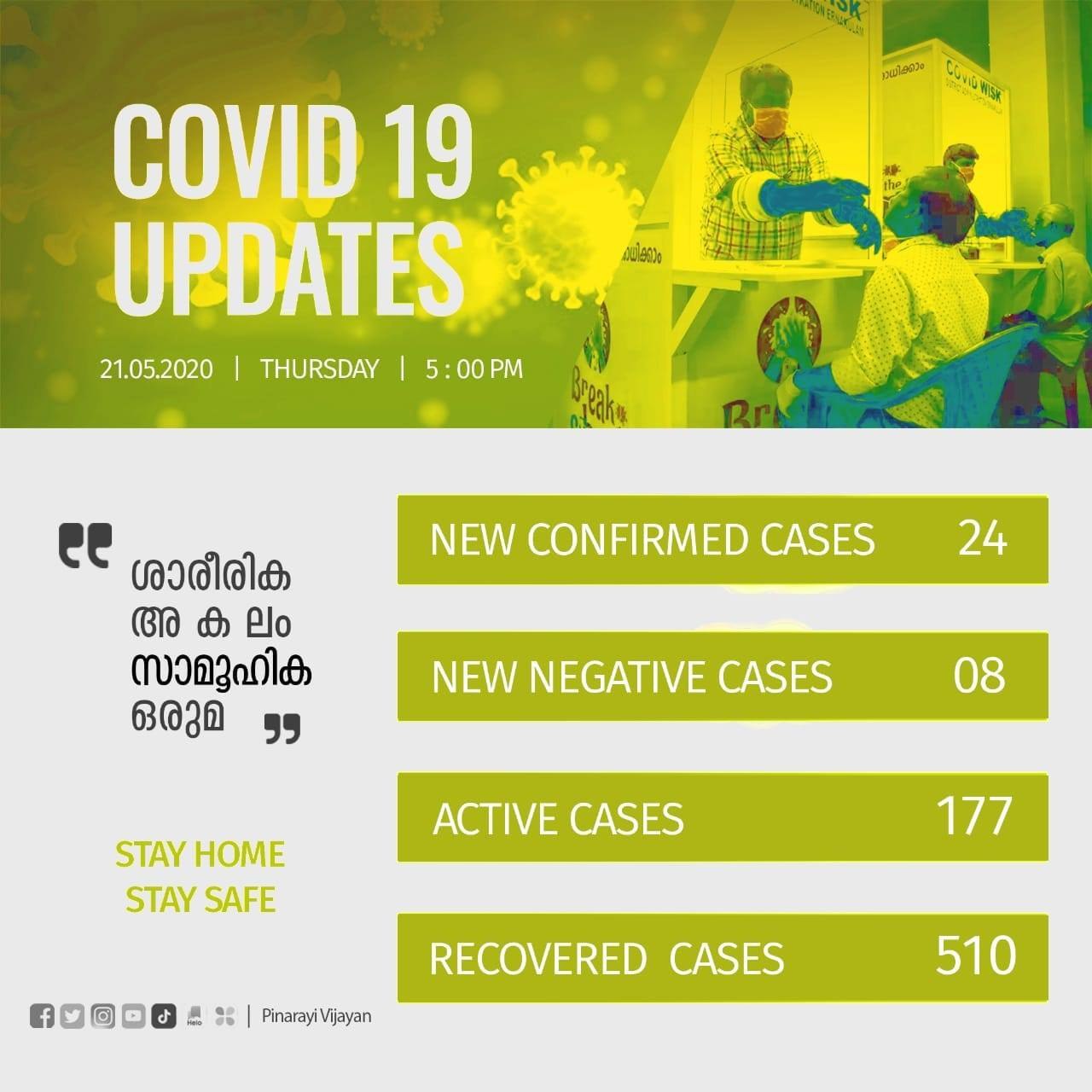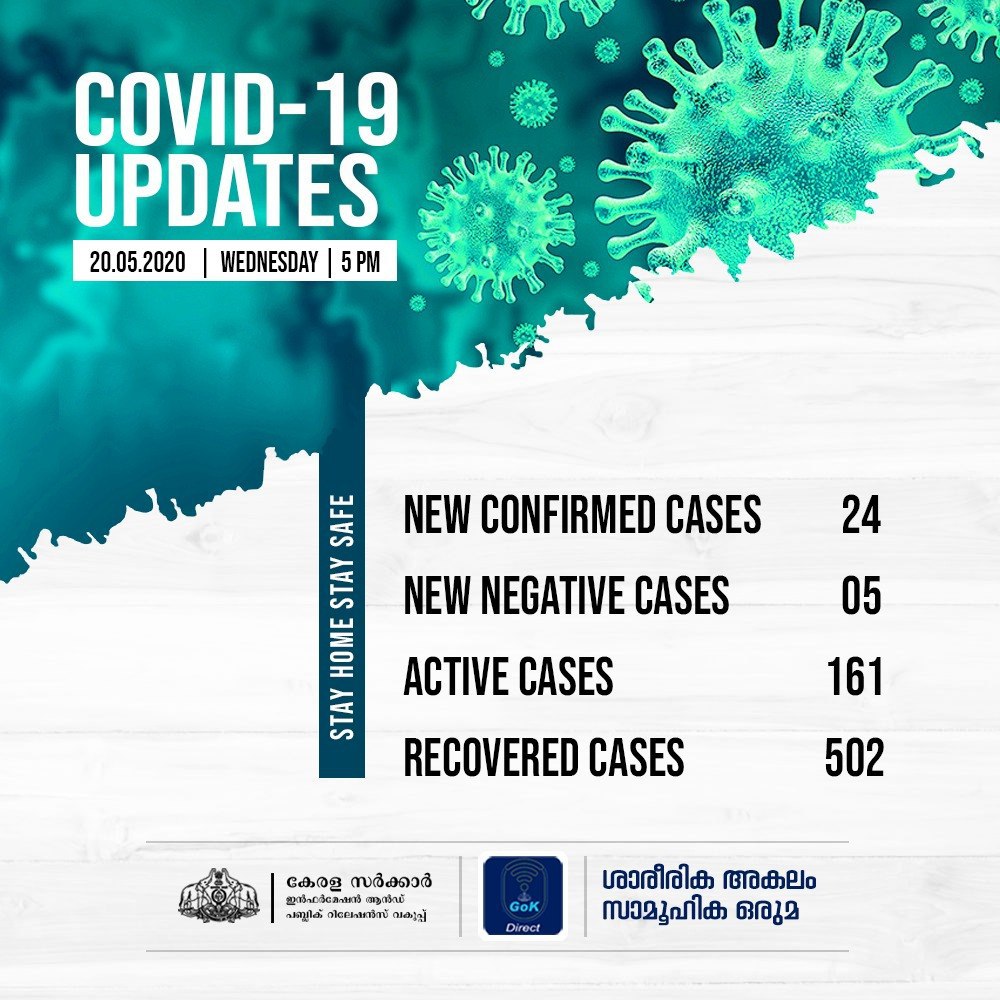 ​​24 പേര്‍ക്കാണ് ഇന്ന് സംസ്ഥാനത്ത് കോവിഡ് ബാധ സ്ഥിരീകരിച്ചത്. അഞ്ചുപേര്‍ക്ക് ഫലം നെഗറ്റീവായി. പാലക്കാട് 7, മലപ്പുറം 4, കണ്ണൂര്‍ 3, പത്തനംതിട്ട, തിരുവനന്തപുരം, തൃശൂര്‍ 2 വീതം, കാസര്‍കോട്, കോഴിക്കോട്, എറണാകുളം, ആലപ്പുഴ ഒന്നുവീതം എന്നിങ്ങനെയാണ് പരിശോധനാ ഫലം പോസിറ്റീവായത്. തൃശൂര്‍ 2, കണ്ണൂര്‍, വയനാട്, കാസര്‍കോട് ഓരോന്ന് എന്നിങ്ങനെയാണ് ഇന്ന് ഫലം നെഗറ്റീവായത്.