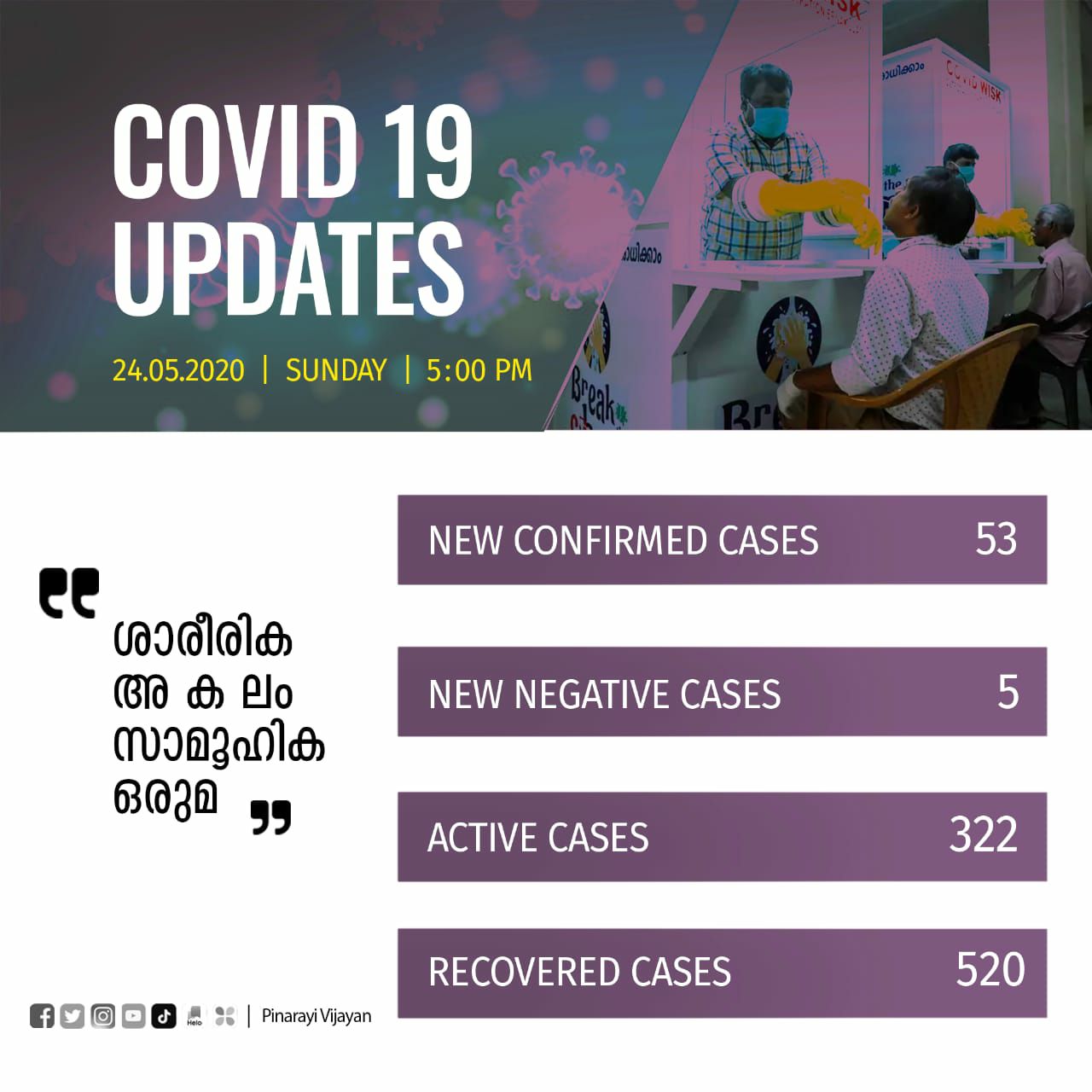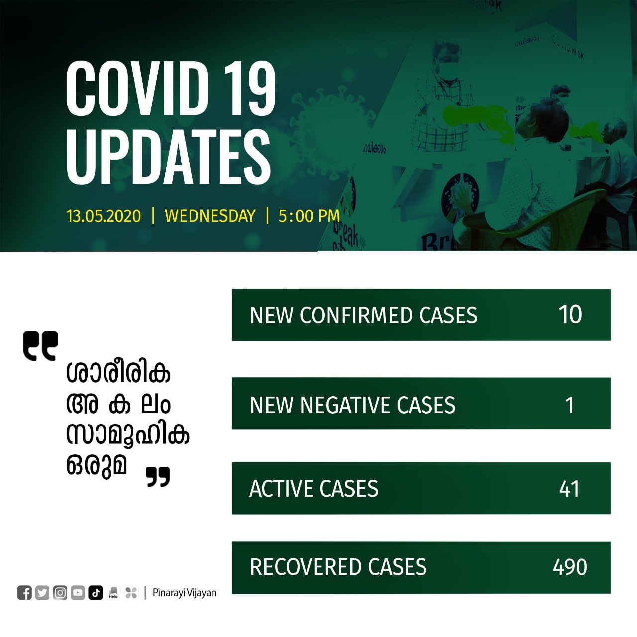കഴിഞ്ഞ കുറേ നാളുകളായി ഒറ്റ അക്കത്തിലായിരുന്നു പുതിയ കേസുകളുടെ എണ്ണം. ഇന്നലെയാണ് അത് പത്ത് ആയി മാറിയത്. ഇന്ന് വീണ്ടും വര്‍ധിച്ചു. നാം നേരിടുന്ന വിപത്തിന്‍റെ സൂചനയാണിത്. എന്നാല്‍, ഈ പ്രതിസന്ധി അഭിമുഖീകരിക്കാനും മറികടക്കാനും കഴിയുമെന്ന ആത്മവിശ്വാസം നമുക്കുണ്ട്. ജനങ്ങളും സര്‍ക്കാര്‍ സംവിധാനങ്ങളും എല്ലാ കരുത്തും ഉപയോഗിച്ച് ഇതിനെ അതിജീവിക്കുക തന്നെ ചെയ്യും.