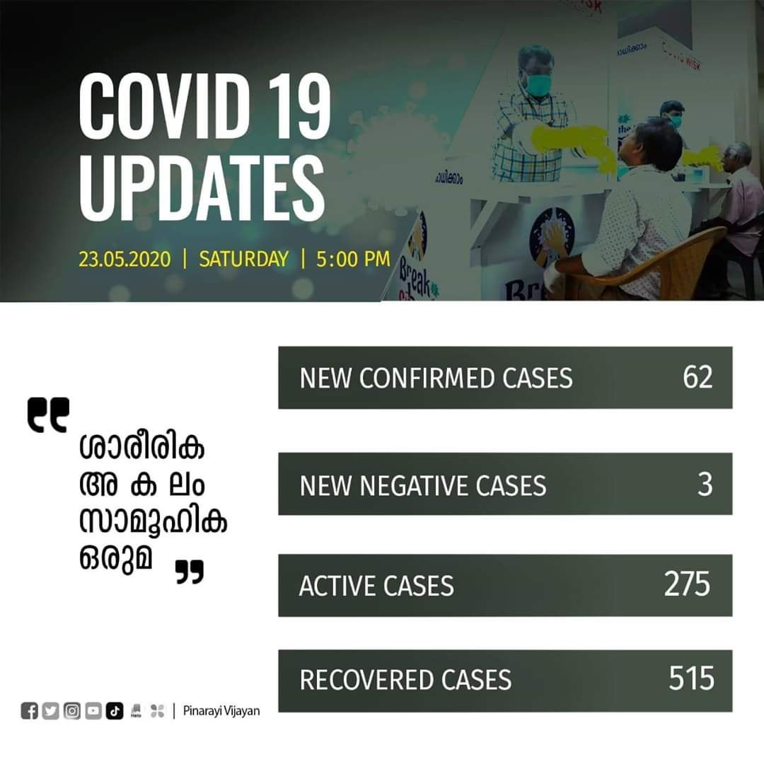 അതേസമയം രോഗം സ്ഥിരികരിച്ച് ചികിത്സയിലായിരുന്ന 3 പേരുടെ പരിശോധനാഫലം നെഗറ്റീവ് ആയിട്ടുണ്ട്. കൊല്ലം, കോട്ടയം, കാസര്‍ഗോഡ് ജില്ലകളില്‍ നിന്നും ഓരോരുത്തരുടെ പരിശോധനാഫലമാണ് നെഗറ്റീവ് ആയത്. ഇതോടെ 275 പേരാണ് രോഗം സ്ഥിരീകരിച്ച് ഇനി ചികിത്സയിലുള്ളത്. 515 പേര്‍ ഇതുവരെ കോവിഡില്‍ നിന്നും മുക്തി നേടി.