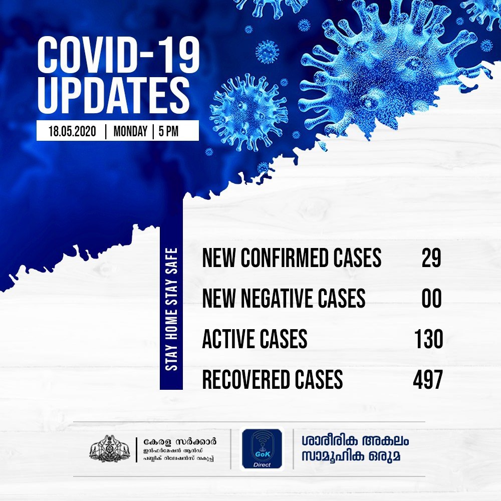 ഇതുവരെ 630 പേര്‍ക്കാണ് സംസ്ഥാനത്ത് രോഗം സ്ഥിരീകരിച്ചത്. അതില്‍ 130 പേര്‍ ഇപ്പോള്‍ ചികിത്സയിലാണ്. 67,789 പേരാണ് ഇപ്പോള്‍ നിരീക്ഷണത്തിലുള്ളത്. 67,316 പേര്‍ വീടുകളിലും 473 പേര്‍ ആശുപത്രികളിലുമാണ്. ഇന്നു മാത്രം 127 പേരെ ആശുപത്രിയില്‍ പ്രവേശിപ്പിച്ചു. ഇതുവരെ 45,905 സാമ്പിളുകളാണ് പരിശോധനയ്ക്ക് അയച്ചത്. 44,651 എണ്ണം രോഗബാധ ഇല്ല എന്നുറപ്പാക്കിയിട്ടുണ്ട്. സെന്‍റിനല്‍ സര്‍വൈലന്‍സിന്‍റെ ഭാഗമായി മുന്‍ഗണനാ വിഭാഗത്തില്‍പ്പെട്ട 5154 സാമ്പിളുകള്‍ ശേഖരിച്ചതില്‍ 5082 നെഗറ്റീവായിട്ടുണ്ട്. 29 ഹോട്ട്സ്പോട്ടുകളാണ് ഇപ്പോള്‍ സംസ്ഥാനത്തുള്ളത്. കൊല്ലത്ത് ഒന്നും പാലക്കാട് അഞ്ചുമായി ആറ് ഹോട്ട്സ്പോട്ടുകള്‍ പുതുതായി വന്നു.