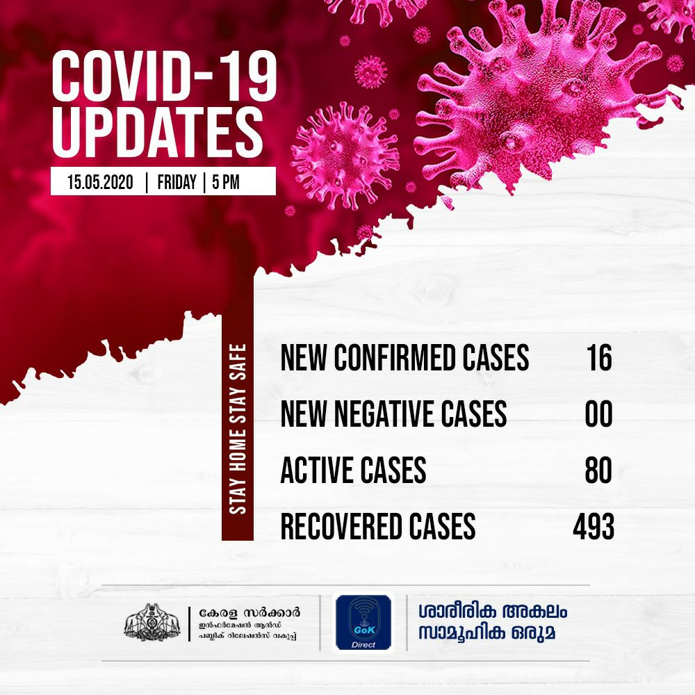 ​​ഇന്ന് 16 പേര്‍ക്കാണ് കോവിഡ് 19 സ്ഥിരീകരിച്ചത്. ഇന്നത്തെ പരിശോധനാ ഫലത്തില്‍ നെഗറ്റീവ് ഇല്ല. വയനാട് 5, മലപ്പുറം 4, ആലപ്പുഴ, കോഴിക്കോട് 2 വീതം, കൊല്ലം, പാലക്കാട്, കാസര്‍കോട് ഒന്നുവീതം എന്നിങ്ങനെയാണ് പരിശോധനാ ഫലം പോസിറ്റീവായത്.