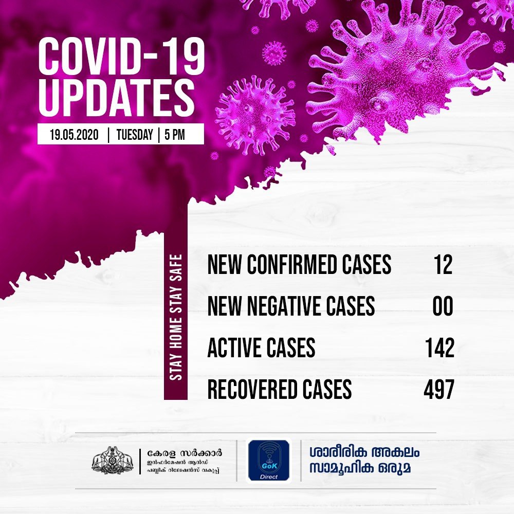 ​​12 പേര്‍ക്കാണ് ഇന്ന് സംസ്ഥാനത്ത് കോവിഡ് ബാധ സ്ഥിരീകരിച്ചത്. ആരുടെയും പരിശോധനാ ഫലം നെഗറ്റീവായിട്ടില്ല. കണ്ണൂര്‍ 5, മലപ്പുറം 3, പത്തനംതിട്ട, ആലപ്പുഴ, തൃശൂര്‍, പാലക്കാട് ഒന്നുവീതം എന്നിങ്ങനെയാണ് പരിശോധനാ ഫലം പോസിറ്റീവായത്. ഇന്ന് പോസിറ്റീവായ എല്ലാ കേസുകളും പുറത്തുനിന്ന് വന്നതാണ്. വിദേശത്തുനിന്ന് നാലുപേര്‍. മറ്റു സംസ്ഥാനങ്ങളില്‍നിന്നു വന്ന എട്ടുപേരില്‍ ആറുപേര്‍ മഹാരാഷ്ട്രയില്‍നിന്നാണ്. ഗുജറാത്തില്‍നിന്ന് ഒരാളും തമിഴ്നാട്ടില്‍നിന്ന് ഒരാളുമുണ്ട്.