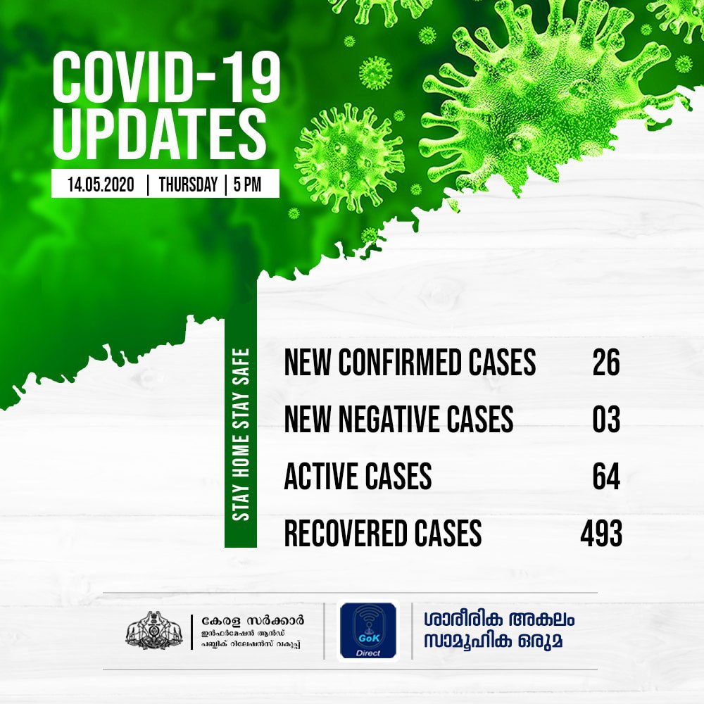 ​​ഇന്ന് 26 പേര്‍ക്കാണ് കോവിഡ് 19 സ്ഥിരീകരിച്ചത്. മൂന്നുപേര്‍ക്ക് നെഗറ്റീവാണ്. കാസര്‍കോട് 10, മലപ്പുറം 5, പാലക്കാട്, വയനാട് മൂന്നുവീതം, കണ്ണൂര്‍ 2, പത്തനംതിട്ട, ഇടുക്കി, കോഴിക്കോട് ഓരോരുത്തര്‍ എന്നിങ്ങനെയാണ് പരിശോധനാ ഫലം പോസിറ്റീവായത്. കൊല്ലം 2, കണ്ണൂര്‍ 1 എന്നിങ്ങനെയാണ് പരിശോധനാ ഫലം നെഗറ്റീവായത്.