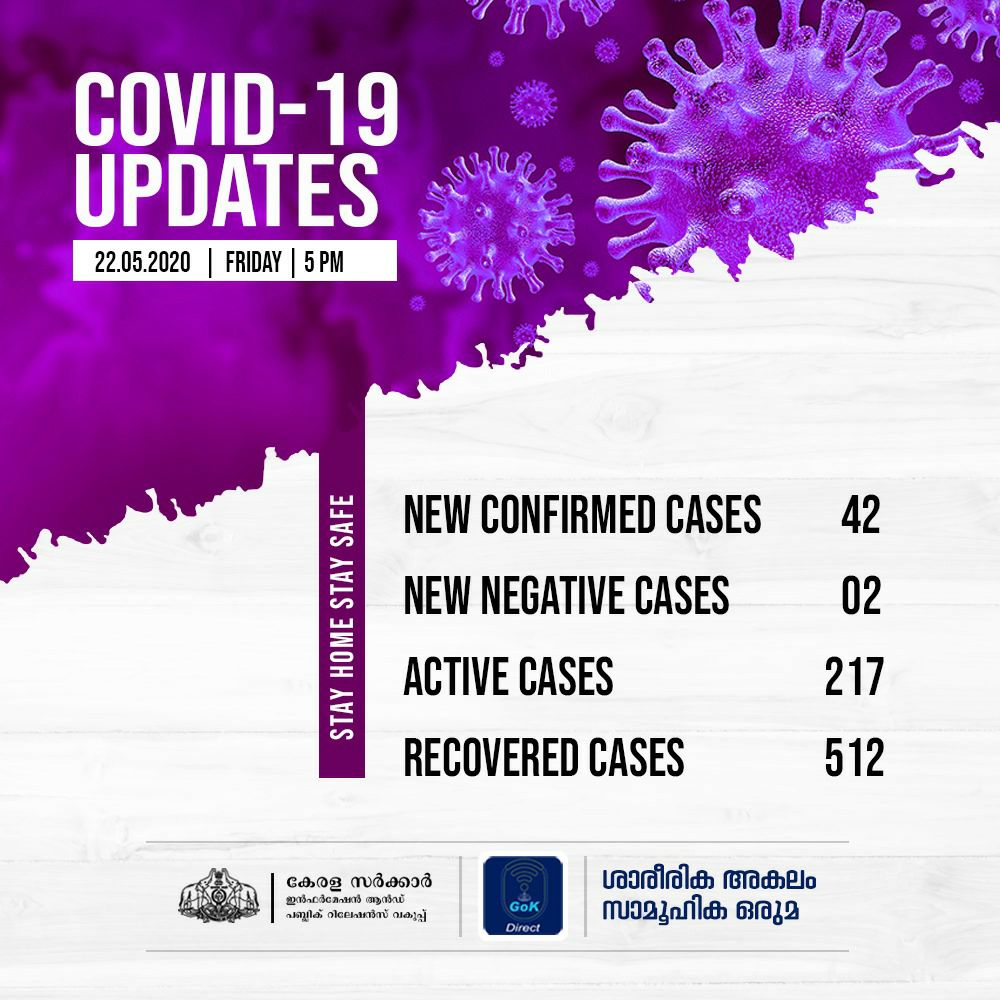 ​​42 പേര്‍ക്കാണ് ഇന്ന് സംസ്ഥാനത്ത് കോവിഡ് സ്ഥിരീകരിച്ചത്. കണ്ണൂര്‍ 12, കാസര്‍കോട് 7, കോഴിക്കോട്, പാലക്കാട് 5 വീതം, തൃശൂര്‍, മലപ്പുറം 4 വീതം, കോട്ടയം 2, കൊല്ലം, പത്തനംതിട്ട, വയനാട് ഒന്നുവീതം എന്നിങ്ങനെയാണ് പരിശോധനാ ഫലം പോസിറ്റീവായത്.