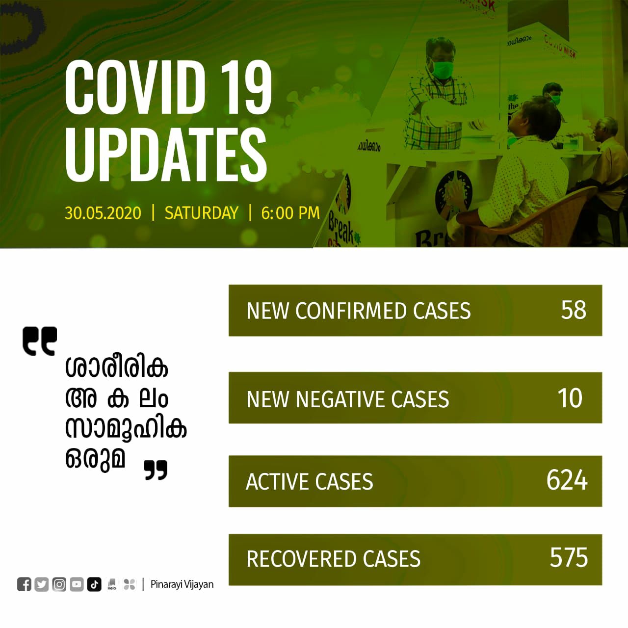 സംസ്ഥാനത്ത് ഇന്ന് 58 പേര്ക്ക് കോവിഡ്-19 സ്ഥിരീകരിച്ചു. തൃശൂര് ജില്ലയില് നിന്നുള്ള 10 പേര്ക്കും പാലക്കാട് ജില്ലയില് നിന്നുള്ള 9 പേര്ക്കും കണ്ണൂര് ജില്ലയില് നിന്നുള്ള 8 പേര്ക്കും കൊല്ലം, ഇടുക്കി, എറണാകുളം, കോഴിക്കോട് ജില്ലകളില് നിന്നുള്ള 4 പേര്ക്ക് വീതവും കാസര്ഗോഡ് ജില്ലയില് നിന്നുള്ള 3 പേര്ക്കും തിരുവനന്തപുരം, ആലപ്പുഴ ജില്ലകളില് നിന്നുള്ള 2 പേര്ക്കും കോട്ടയം ജില്ലയില് നിന്നുള്ള ഒരാള്ക്കുമാണ് രോഗം സ്ഥിരീകരിച്ചത്. ഇതുകൂടാതെ 7 എയര് ഇന്ത്യ ജീവനക്കാര്ക്കും രോഗം സ്ഥിരീകരിച്ചു.