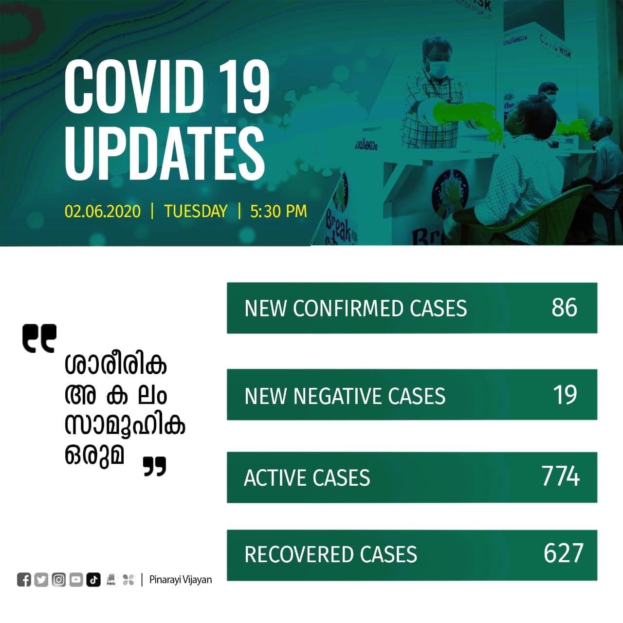 സംസ്ഥാനത്ത് ഇന്ന് 86 പേര്ക്ക് കോവിഡ്-19 സ്ഥിരീകരിച്ചു. മലപ്പുറം ജില്ലയില് നിന്നുള്ള 15 പേര്ക്കും ആലപ്പുഴ ജില്ലയില് നിന്നുള്ള 10 പേര്ക്കും കാസറഗോഡ് ജില്ലയില് നിന്നുള്ള 9 പേര്ക്കും കൊല്ലം ജില്ലയില് നിന്നുള്ള 8 പേര്ക്കും തിരുവനന്തപുരം ജില്ലയില് നിന്നുള്ള 7 പേര്ക്കും (ഒരാള് മരണമടഞ്ഞു) കോട്ടയം, തൃശൂര്, വയനാട് ജില്ലകളില് നിന്നുള്ള 6 പേര്ക്ക് വീതവും പാലക്കാട്, കോഴിക്കോട്, കണ്ണൂര് ജില്ലകളില് നിന്നുള്ള 5 പേര്ക്ക് വീതവും എറണാകുളം ജില്ലയില് നിന്നുള്ള 3 പേര്ക്കും പത്തനംതിട്ട ജില്ലയില് നിന്നുള്ള ഒരാള്ക്കുമാണ് രോഗം സ്ഥിരീകരിച്ചത്. ഇതില് 46 പേര് വിദേശത്ത് നിന്നും (കുവൈറ്റ്-21, യു.എ.ഇ.-16, സൗദി അറേബ്യ-6, മാലിദ്വീപ്-1, ഖത്തര്-1, ഒമാന്-1) 26 പേര് മറ്റ് സംസ്ഥാനങ്ങളില് (മഹാരാഷ്ട്ര-9, തമിഴ്നാട്-7, കര്ണാടക-5, ഡല്ഹി-3, ഗുജറാത്ത്-1, രാജസ്ഥാന്-1) നിന്നും വന്നതാണ്. 12 പേര്ക്ക് സമ്പര്ക്കത്തിലൂടെയാണ് രോഗം ബാധിച്ചത്. വയനാട് ജില്ലയിലെ 6 പേര്ക്കും മലപ്പുറം ജില്ലയിലെ 4 പേര്ക്കും കാസര്ഗോഡ്, കണ്ണൂര് ജില്ലകളിലെ ഒരാള്ക്ക് വിതവുമാണ് സമ്പര്ക്കത്തിലൂടെ രോഗം സ്ഥിരീകരിച്ചത്. പാലക്കാട് ജില്ലയിലെ ഒരു ആരോഗ്യ പ്രവര്ത്തകയ്ക്കും രോഗം ബാധിച്ചു.
