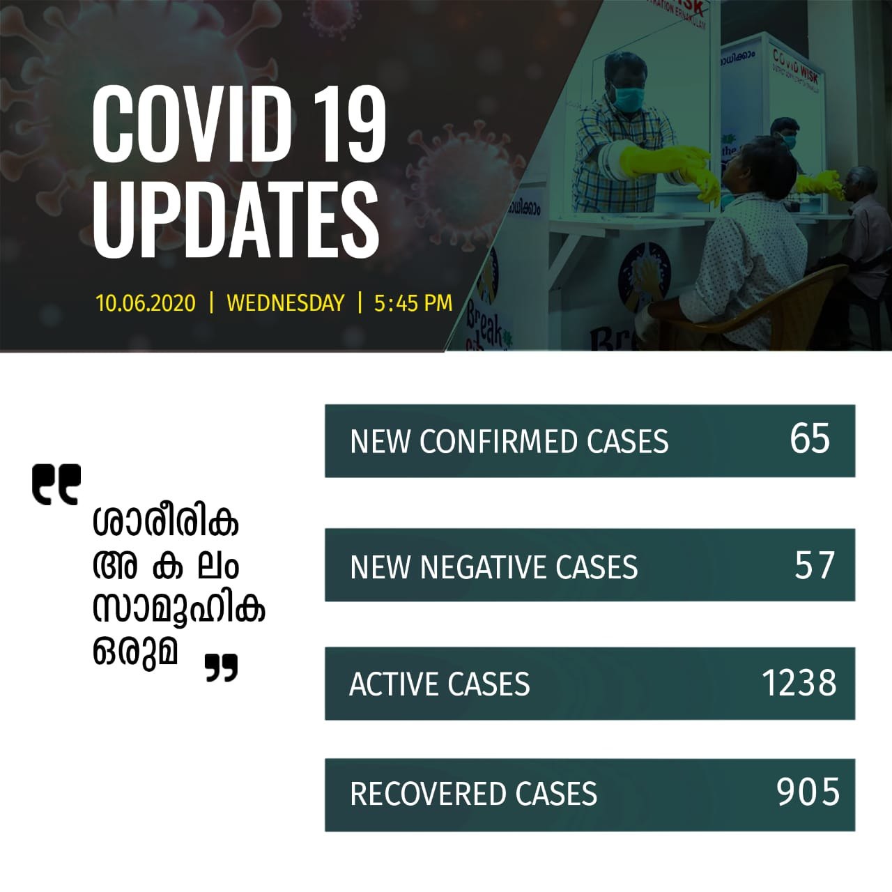 സംസ്ഥാനത്ത് ഇന്ന് 65 പേര്ക്കാണ് കോവിഡ്-19 സ്ഥിരീകരിച്ചത്. കോഴിക്കോട് ജില്ലയില് നിന്നുള്ള 10 പേര്ക്കും, തൃശൂര് ജില്ലയില് നിന്നുള്ള 9 പേര്ക്കും (ഒരാള് മരണമടഞ്ഞു), മലപ്പുറം ജില്ലയില് നിന്നുള്ള 7 പേര്ക്കും, തിരുവനന്തപുരം, പാലക്കാട് ജില്ലകളില് നിന്നുള്ള 6 പേര്ക്ക് വീതവും, കൊല്ലം, ഇടുക്കി, എറണാകുളം, വയനാട്, കണ്ണൂര് ജില്ലകളില് നിന്നുള്ള 4 പേര്ക്ക് വീതവും, പത്തനംതിട്ട, കോട്ടയം ജില്ലകളില് നിന്നുള്ള 3 പേര്ക്ക് വീതവും, ആലപ്പുഴ ജില്ലയില് നിന്നുള്ള ഒരാള്ക്കുമാണ് രോഗം സ്ഥിരീകരിച്ചത്.