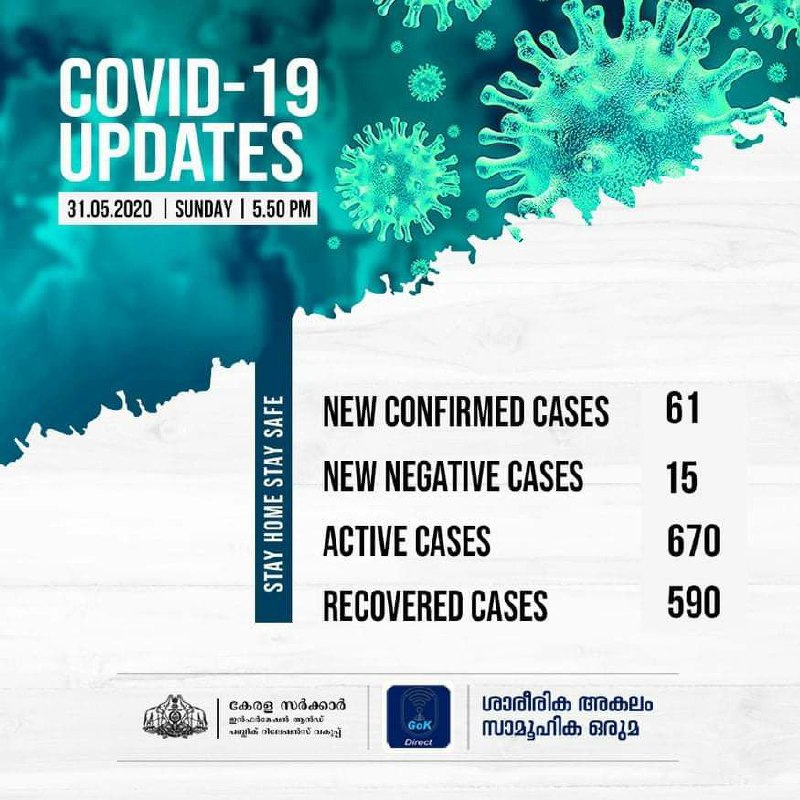 61 പേര്ക്കാണ് സംസ്ഥാനത്ത് ഇന്ന് കോവിഡ്-19 സ്ഥിരീകരിച്ചത്. പാലക്കാട് ജില്ലയില് നിന്നുള്ള 12 പേര്ക്കും കാസറഗോഡ് ജില്ലയില് നിന്നുള്ള 10 പേര്ക്കും കണ്ണൂര് ജില്ലയില് നിന്നുള്ള 7 പേര്ക്കും കൊല്ലം, ആലപ്പുഴ ജില്ലകളില് നിന്നുള്ള 6 പേര്ക്ക് വീതവും തിരുവനന്തപുരം, പത്തനംതിട്ട ജില്ലകളില് നിന്നുള്ള 4 പേര്ക്ക് വീതവും തൃശൂര്, മലപ്പുറം, വയനാട് ജില്ലകളില് നിന്നുള്ള 3 പേര്ക്ക് വീതവും കോഴിക്കോട് ജില്ലയില് നിന്നുള്ള 2 പേര്ക്കും എറണാകുളം ജില്ലയില് നിന്നുള്ള ഒരാള്ക്കുമാണ് രോഗം സ്ഥിരീകരിച്ചത്. ഇതില് 20 പേര് വിദേശത്ത് നിന്നും (യു.എ.ഇ.-8, കുവൈറ്റ്-5, ഒമാന്-4, സൗദി അറേബ്യ-1, ഖത്തര്-1, മാലിദ്വീപ്-1) 37 പേര് മറ്റ് സംസ്ഥാനങ്ങളില് (മഹാരാഷ്ട്ര-20, തമിഴ്നാട്-6, ഡല്ഹി-5, കര്ണാടക-4, ഗുജറാത്ത്-1, രാജസ്ഥാന്-1) നിന്നും വന്നതാണ്. 4 പേര്ക്ക് സമ്പര്ക്കത്തിലൂടെയാണ് രോഗം ബാധിച്ചത്. പാലക്കാട്, കൊല്ലം ജില്ലകളിലുള്ള 2 പേര്ക്ക് വീതമാണ് സമ്പര്ക്കത്തിലൂടെ രോഗം ബാധിച്ചത്.