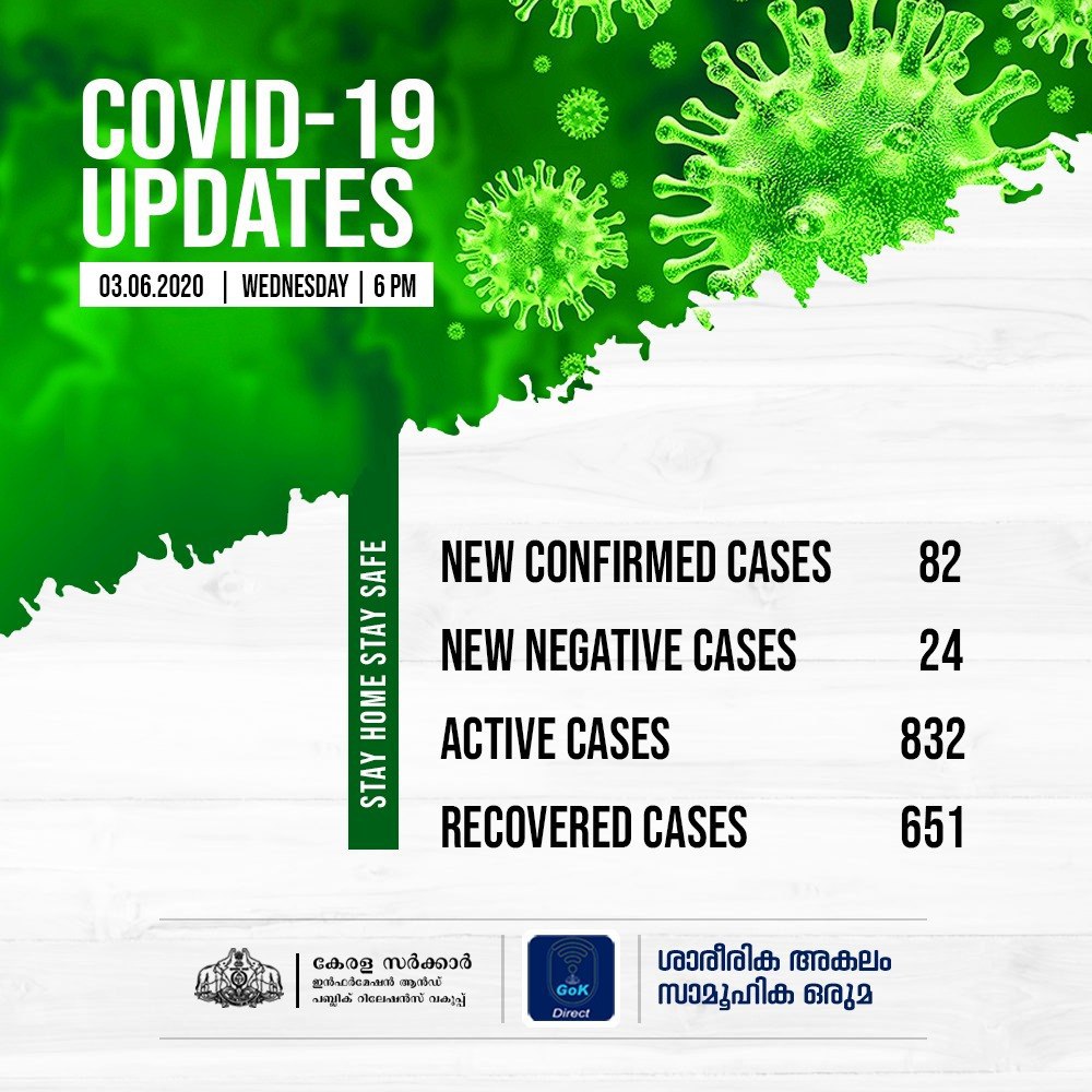 കേരളത്തില് ഇന്ന് 82 പേര്ക്ക് കോവിഡ്-19 സ്ഥിരീകരിച്ചു.. തിരുവനന്തപുരം ജില്ലയില് നിന്നുള്ള 14 പേര്ക്കും മലപ്പുറം ജില്ലയില് നിന്നുള്ള 11 പേര്ക്കും ഇടുക്കി ജില്ലയില് നിന്നുള്ള 9 പേര്ക്കും കോട്ടയം ജില്ലയില് നിന്നുള്ള 8 പേര്ക്കും ആലപ്പുഴ, കോഴിക്കോട് ജില്ലകളില് നിന്നുള്ള 7 പേര്ക്ക് വീതവും പാലക്കാട്, കൊല്ലം, എറണാകുളം ജില്ലകളില് നിന്നുള്ള 5 പേര്ക്ക് വീതവും, തൃശൂര് ജില്ലയില് നിന്നുള്ള 4 പേര്ക്കും കാസര്ഗോഡ് ജില്ലയില് നിന്നുള്ള 3 പേര്ക്കും, പത്തനംതിട്ട, കണ്ണൂര് ജില്ലയില് നിന്നുള്ള 2 പേര്ക്ക് വീതവുമാണ് രോഗം സ്ഥിരീകരിച്ചത്.