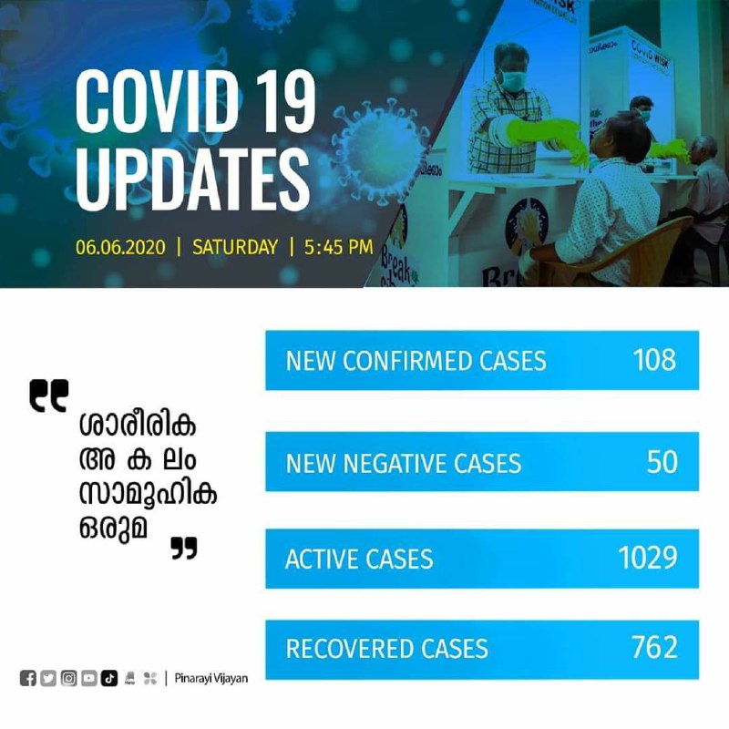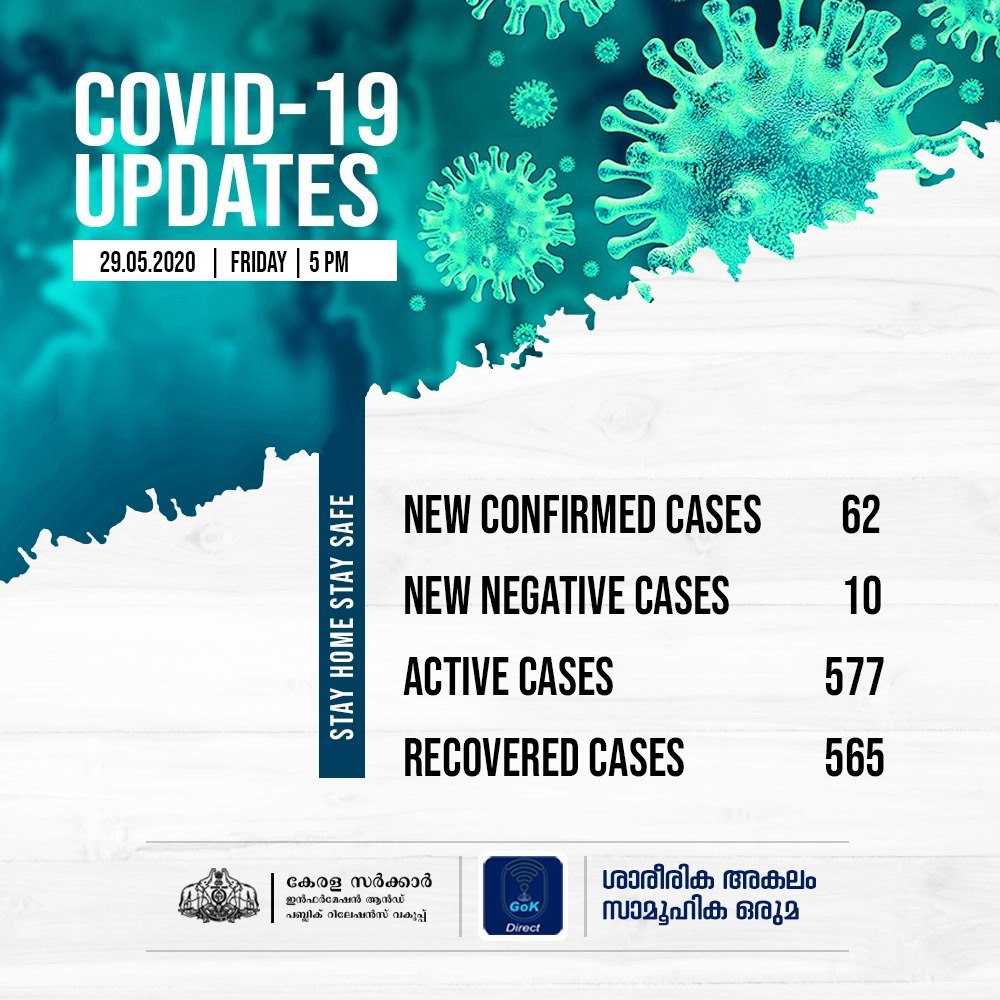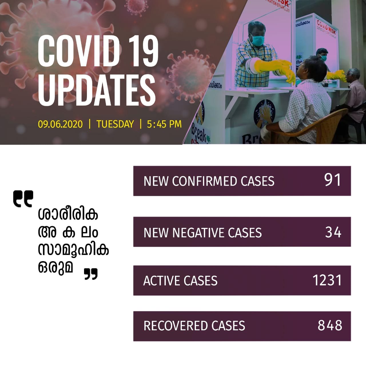 ചികിത്സയിലായിരുന്ന 34 പേരുടെ പരിശോധനാഫലം നെഗറ്റീവ് ആയി. തിരുവനന്തപുരം ജില്ലയില് നിന്നുള്ള 12 പേരുടെയും (ഒരു കൊല്ലം സ്വദേശി), പത്തനംതിട്ട ജില്ലയില് നിന്നുള്ള 6 പേരുടെയും, തൃശൂര്, കോഴിക്കോട് (ഒരു വയനാട് സ്വദേശി) ജില്ലകളില് നിന്നുള്ള 4 പേരുടെ വീതവും കൊല്ലം, ആലപ്പുഴ, കോട്ടയം ജില്ലകളില് നിന്നുള്ള 2 പേരുടെ വീതവും, ഇടുക്കി, എറണാകുളം ജില്ലകളില് നിന്നുള്ള ഓരോരുത്തരുടെ വീതവും പരിശോധനാഫലമാണ് നെഗറ്റീവ് ആയത്. 1231 പേരാണ് രോഗം സ്ഥിരീകരിച്ച് ചികിത്സയിലുള്ളത്. 848 പേര് ഇതുവരെ കോവിഡ് മുക്തരായി.