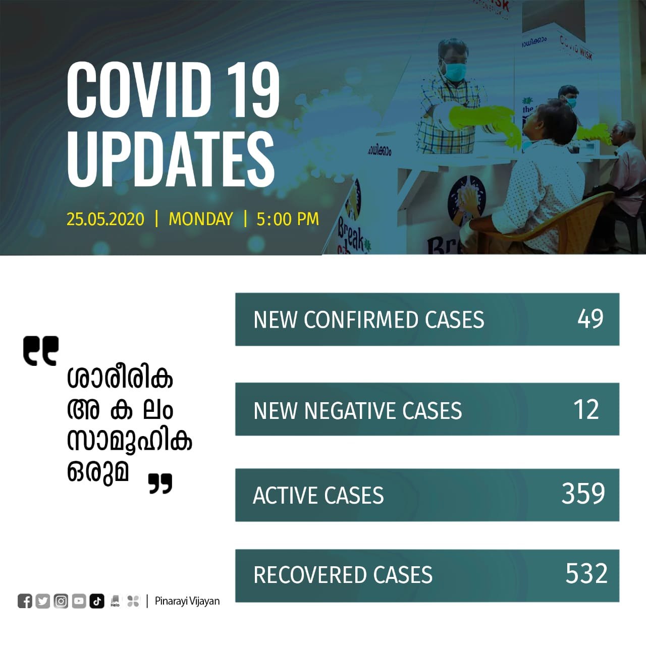 സംസ്ഥാനത്ത് 49 പേര്ക്കാണ് ഇന്ന് കോവിഡ്-19 സ്ഥിരീകരിച്ചത്. കാസര്ഗോഡ് ജില്ലയില് നിന്നുള്ള 14 പേര്ക്കും കണ്ണൂര് ജില്ലയില് നിന്നുള്ള 10 പേര്ക്കും, തിരുവനന്തപുരം, പാലക്കാട് ജില്ലകളില് നിന്നുള്ള 5 പേര്ക്ക് വീതവും കോഴിക്കോട് ജില്ലയില് നിന്നുള്ള 4 പേര്ക്കും പത്തനംതിട്ട, ആലപ്പുഴ ജില്ലകളില് നിന്നുള്ള 3 പേര്ക്ക് വീതവും കൊല്ലം, കോട്ടയം ജില്ലകളില് നിന്നുള്ള 2 പേര്ക്ക് വീതവും ഇടുക്കി ജില്ലയില് നിന്നുള്ള ഒരാള്ക്കുമാണ് രോഗം സ്ഥിരീകരിച്ചത്. വിദേശത്ത് നിന്നും 18 പേരും (യു.എ.ഇ.-12, ഒമാന്-1, സൗദി അറേബ്യ-1, അബുദാബി-1, മാലി ദ്വീപ്-1, കുവൈറ്റ്-1, മസ്കറ്റ്-1) 25 പേര് സംസ്ഥാനത്തിന് പുറത്ത് നിന്നും (മഹാരാഷ്ട്ര-17, തമിഴ്നാട്-4, ഡല്ഹി-2, കര്ണാടക-2) വന്നതാണ്. 6 പേര്ക്ക് സമ്പര്ക്കത്തിലൂടെയാണ് രോഗം ബാധിച്ചത്. ഇതില് കണ്ണൂര് ജില്ലയിലെ രണ്ട് പേര് റിമാണ്ട് തടവുകാരാണ്. തിരുവനന്തപുരത്തെ ഒരാള് ആരോഗ്യ പ്രവര്ത്തകനാണ്.