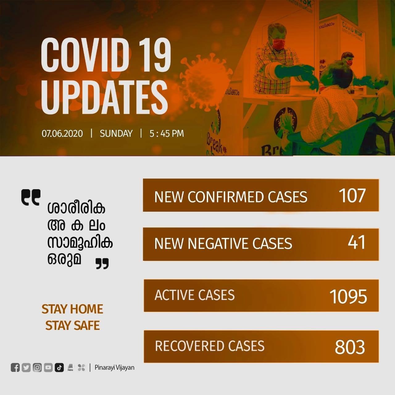ഇന്ന് 107 പേര്ക്കാണ് സംസ്ഥാനത്ത് കോവിഡ്-19 സ്ഥിരീകരിച്ചത്. മലപ്പുറം ജില്ലയില് 27 പേര്ക്കും തൃശ്ശൂരിൽ 26 പേര്ക്കും രോഗബാധയുണ്ടായി. പത്തനംതിട്ട 13, കൊല്ലം 9, ആലപ്പുഴ 7, പാലക്കാട്, കോഴിക്കോട് ജില്ലകളില് 6 പേര്ക്ക് വീതം, തിരുവനന്തപുരം 4, കോട്ടയം, കാസര്ഗോഡ് ജില്ലകളില് 3 പേര്ക്ക് വീതം, കണ്ണൂര് 2, ഇടുക്കി ജില്ലയില് ഒന്ന് എന്നിങ്ങനെയാണ് രോഗം സ്ഥിരീകരിച്ചത്.