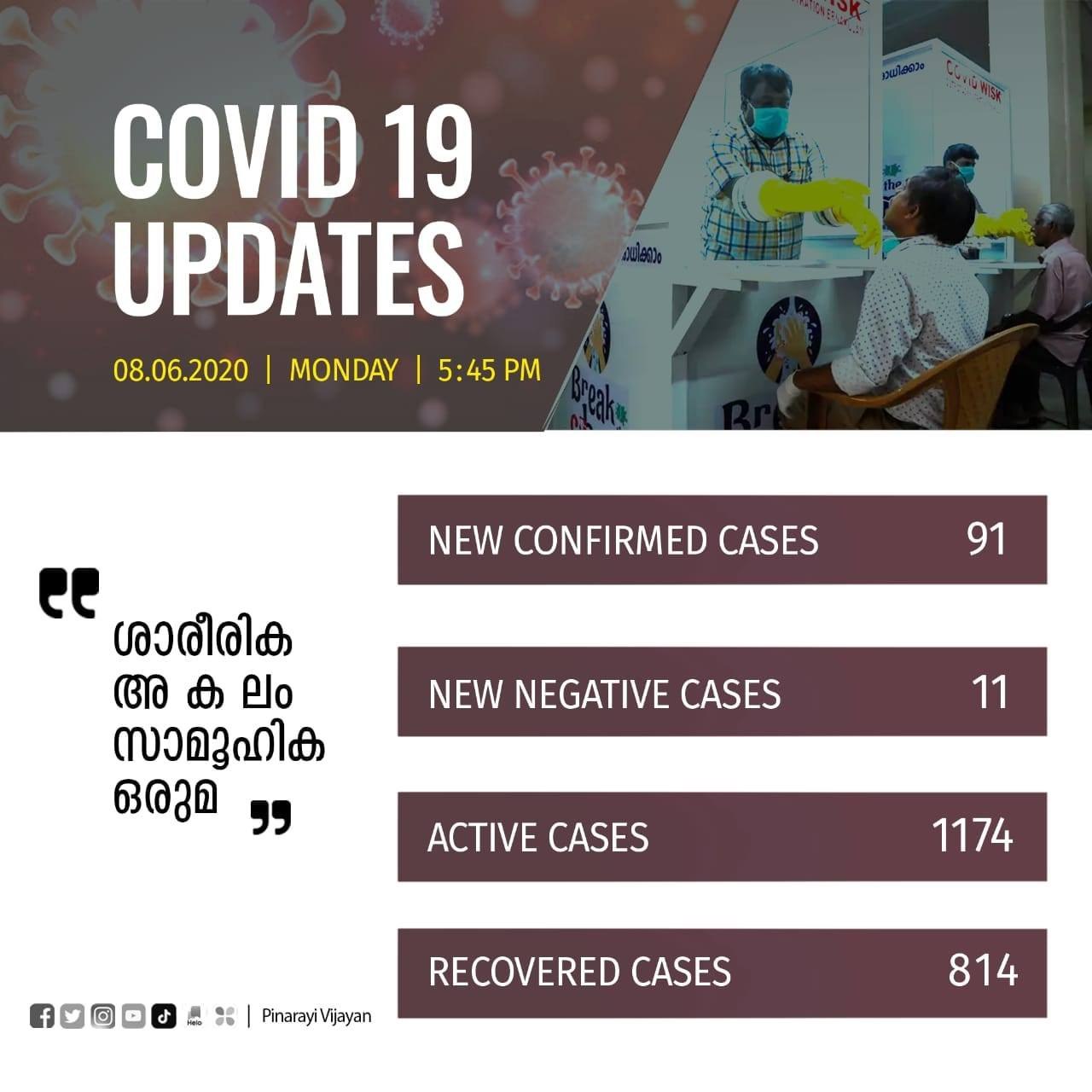 ജൂണ് ഒന്നിന് 57 പേര്ക്കാണ് രോഗബാധ സ്ഥിരീകരിച്ചതെങ്കില് രണ്ടിന് 86 ആയി അത് ഉയര്ന്നു. ജൂണ് മൂന്നിന് 82, നാലിന് 94, ഇന്ന് 111 എന്നതാണ് നില. സ്ഥിതി കൂടുതല് രൂക്ഷമാവുകയാണ്. ഇന്ന് രോഗം ബാധിച്ചവരില് 50 പേര് വിദേശത്തുനിന്ന് വന്നവരാണ്. മറ്റു സംസ്ഥാനങ്ങളില്നിന്ന് 48 പേര്. സമ്പര്ക്കം 10. ആരോഗ്യപ്രവര്ത്തകര് 3. മഹാരാഷ്ട്ര 25, തമിഴ്നാട് 10, കര്ണാടക 3, ഉത്തര്പ്രദേശ്, ഹരിയാന, ലക്ഷദ്വീപ് ഒന്നുവീതം, ഡെല്ഹി 4, ആന്ധ്രപ്രദേശ് 3 എന്നിങ്ങനെയാണ് മറ്റു സംസ്ഥാനങ്ങളില് വന്ന് രോഗബാധ സ്ഥിരീകരിച്ചവരുടെ കണക്ക്.
