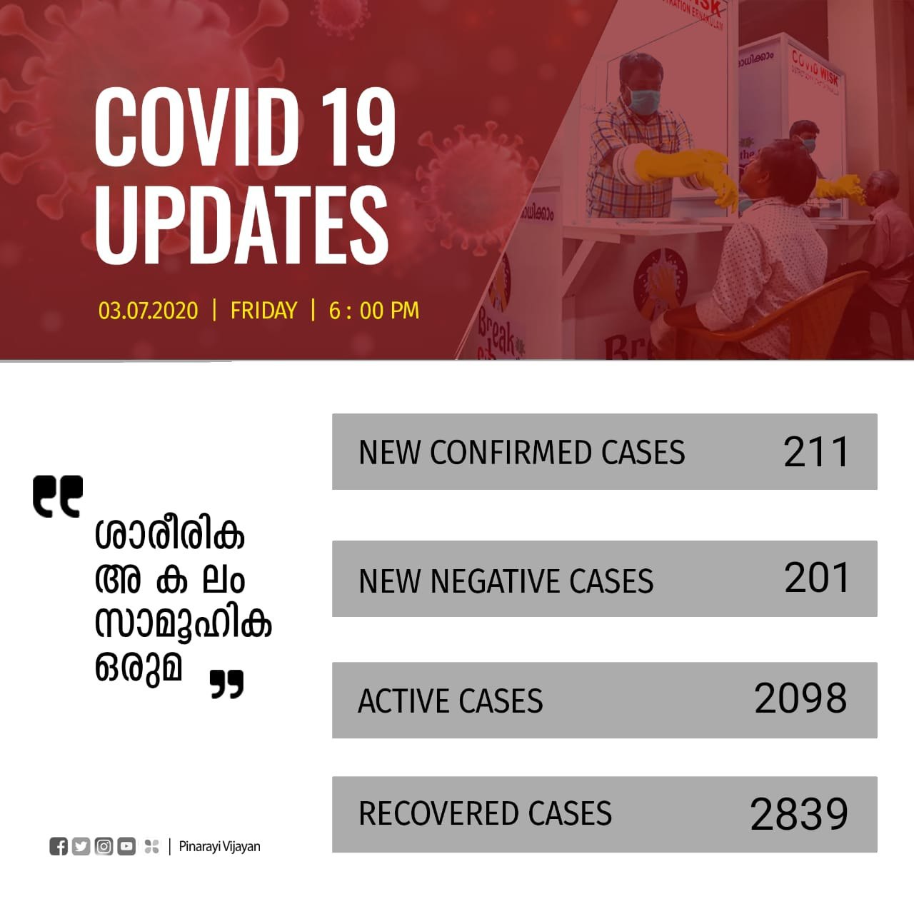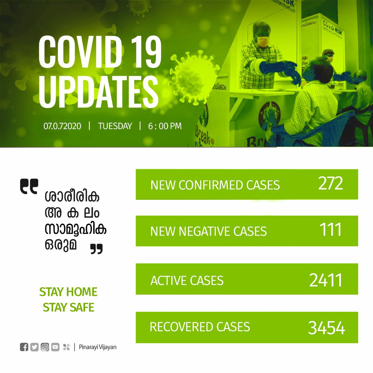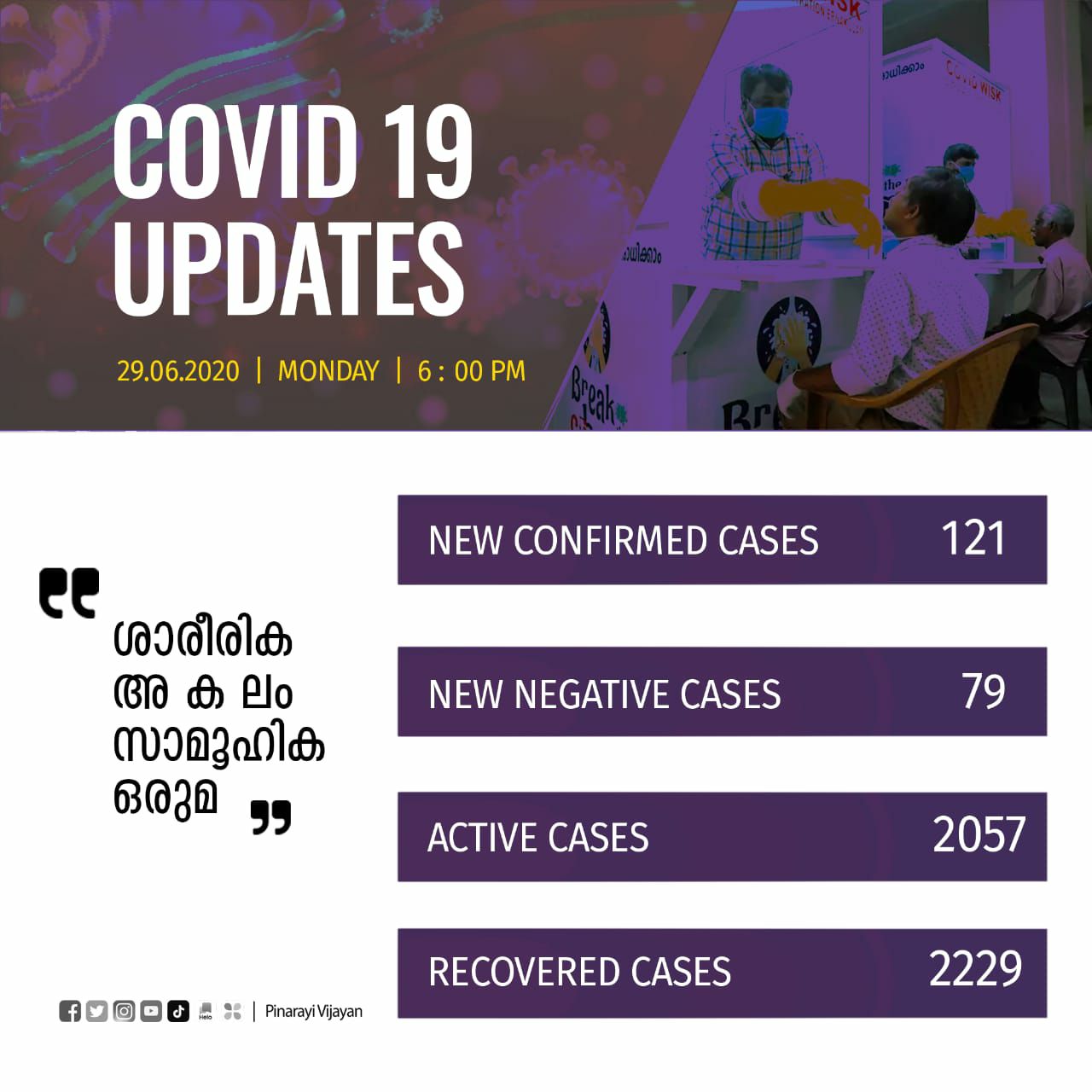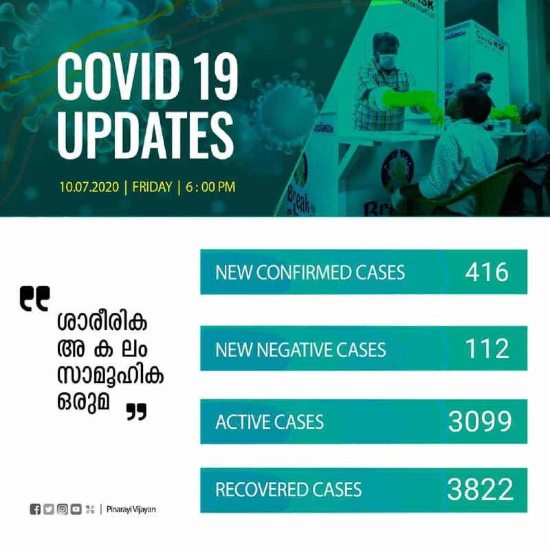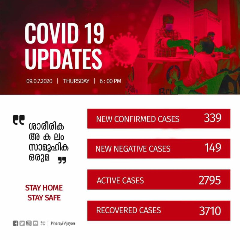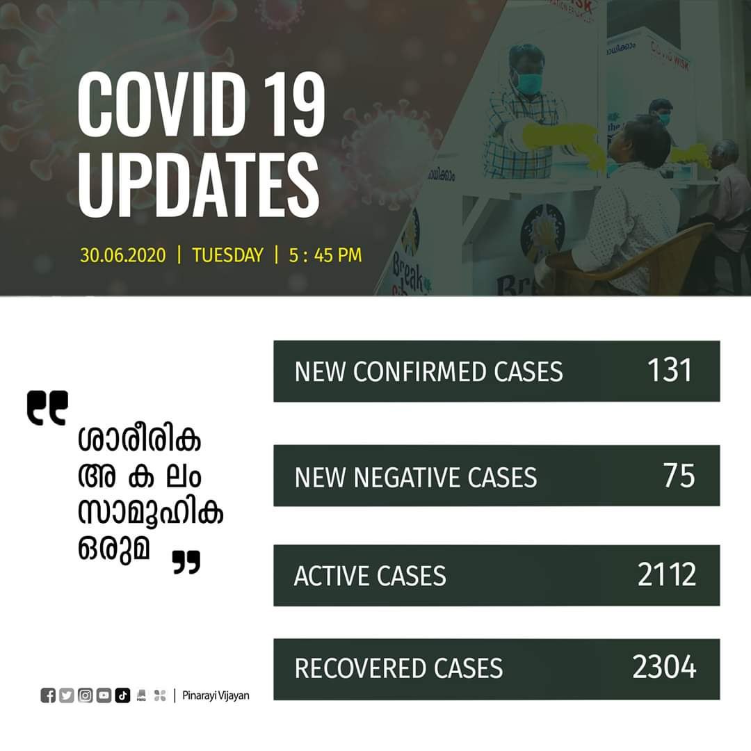 രോഗം സ്ഥിരീകരിച്ച് ചികിത്സയിലായിരുന്ന 111 പേരുടെ പരിശോധനാഫലം നെഗറ്റീവ് ആയി. പാലക്കാട് ജില്ലയില് നിന്നുള്ള 23 പേരുടെയും, എറണാകുളം (പാലക്കാട്-1, മലപ്പുറം-1) ജില്ലയില് നിന്നുള്ള 20 പേരുടെയും, പത്തനംതിട്ട ജില്ലയില് നിന്നുള്ള 19 പേരുടെയും, മലപ്പുറം ജില്ലയില് നിന്നുള്ള 10 പേരുടെയും, കണ്ണൂര് (കാസറഗോഡ്-1) ജില്ലയില് നിന്നുള്ള 9 പേരുടെയും, കൊല്ലം, തൃശൂര്, കോഴിക്കോട് (വയനാട്-1) ജില്ലകളില് നിന്നുള്ള 6 പേരുടെ വീതവും, ആലപ്പുഴ ജില്ലയില് നിന്നുള്ള 4 പേരുടെയും, തിരുവനന്തപുരം (കൊല്ലം-10), വയനാട് ജില്ലകളില് നിന്നുള്ള 3 പേരുടെയും, കോട്ടയം, ഇടുക്കി ജില്ലകളില് നിന്നുള്ള ഒരാളുടെ വീതവും പരിശോധനാഫലം ആണ് ഇന്ന് നെഗറ്റീവ് ആയത്. ഇതോടെ 2411 പേരാണ് രോഗം സ്ഥിരീകരിച്ച് ഇനി ചികിത്സയിലുള്ളത്. 3454 പേര് ഇതുവരെ കോവിഡില് നിന്നും മുക്തി നേടി.