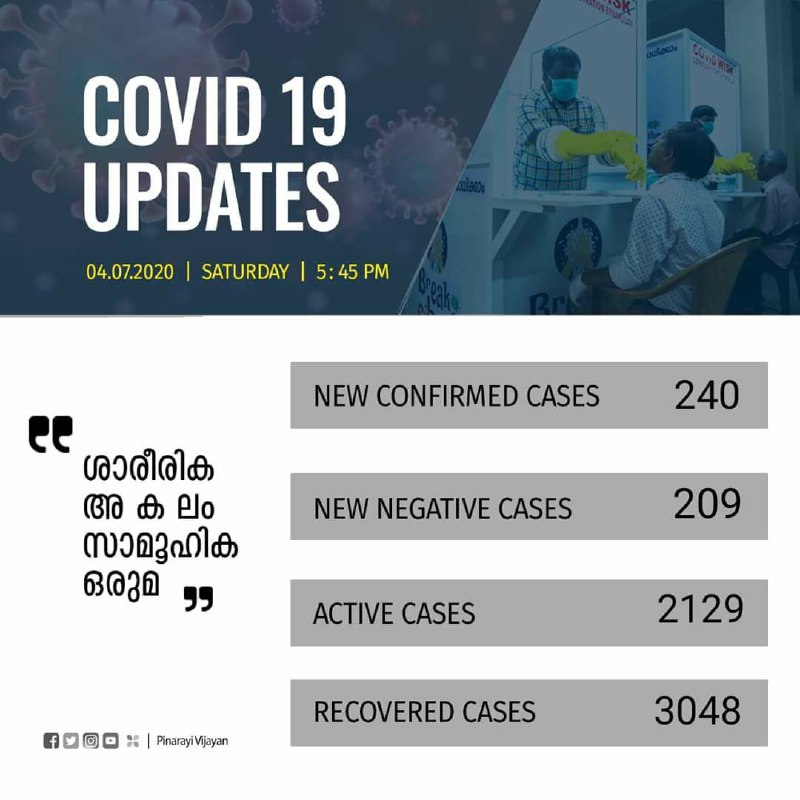 ഇന്ന് സംസ്ഥാനത്ത് 240 പേര്ക്ക് കോവിഡ്-19 സ്ഥിരീകരിച്ചു. മലപ്പുറം ജില്ലയില് നിന്നുള്ള 37 പേര്ക്കും, കണ്ണൂര് ജില്ലയില് നിന്നുള്ള 35 പേര്ക്കും, പാലക്കാട് ജില്ലയില് നിന്നുള്ള 29 പേര്ക്കും, പത്തനംതിട്ട ജില്ലയില് നിന്നുള്ള 22 പേര്ക്കും, ആലപ്പുഴ, തൃശൂര് ജില്ലകളില് നിന്നുള്ള 20 പേര്ക്ക് വീതവും, തിരുവനന്തപുരം, കൊല്ലം ജില്ലകളില് നിന്നുള്ള 16 പേര്ക്ക് വീതവും, കാസര്ഗോഡ് ജില്ലയില് നിന്നുള്ള 14 പേര്ക്കും, എറണാകുളം ജില്ലയില് നിന്നുള്ള 13 പേര്ക്കും, കോഴിക്കോട് ജില്ലയില് നിന്നുള്ള 8 പേര്ക്കും, കോട്ടയം ജില്ലയില് നിന്നുള്ള 6 പേര്ക്കും ഇടുക്കി, വയനാട് ജില്ലകളില് നിന്നുള്ള 2 പേര്ക്കുമാണ് ഇന്ന് രോഗം സ്ഥിരീകരിച്ചത്.