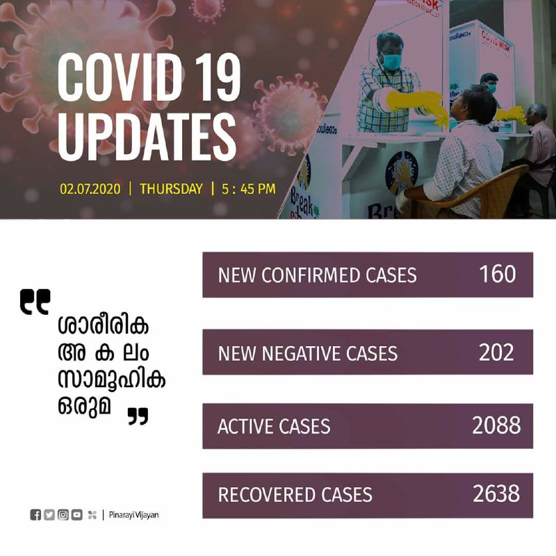 സംസ്ഥാനത്ത് ഇന്ന് 160 പേര്ക്ക് കോവിഡ്-19 സ്ഥിരീകരിച്ചു. ഏറ്റവുമധികം പേര് രോഗ മുക്തരായ ദിനം കൂടിയാണിന്ന്. ചികിത്സയിലായിരുന്ന 202 പേരുടെ പരിശോധനാഫലം നെഗറ്റീവ് ആയി.