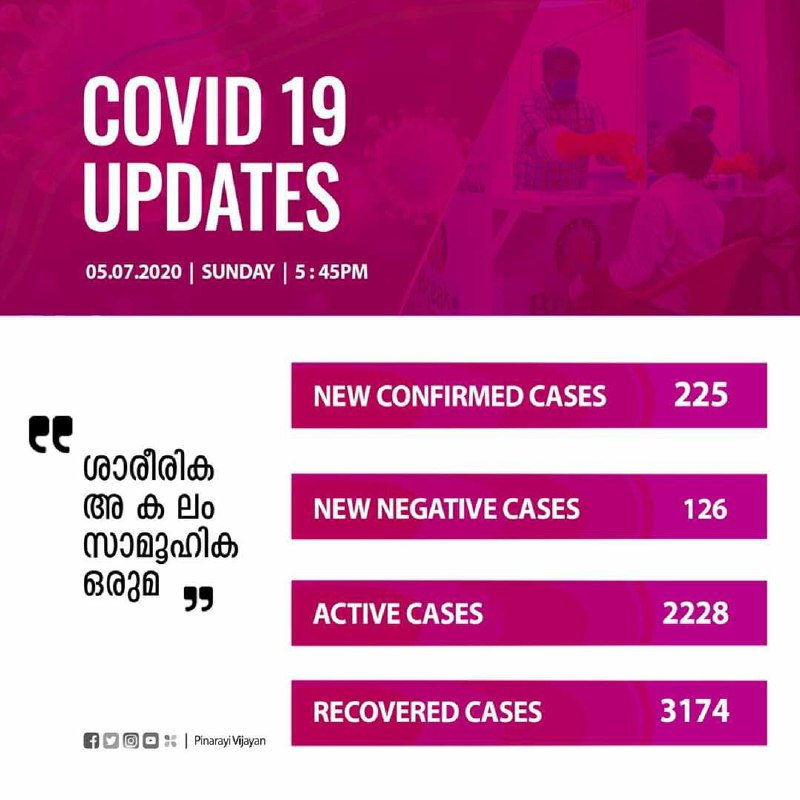 ഇന്ന് 225 പേർക്കാണ് കോവിഡ്-19 സ്ഥിരീകരിച്ചത്. പാലക്കാട് ജില്ലയില് 29 പേര്ക്കും, കാസര്ഗോഡ് 28 പേര്ക്കും, തിരുവനന്തപുരം 27 പേര്ക്കും, മലപ്പുറം 26 പേര്ക്കും, കണ്ണൂര് 25 പേര്ക്കും, കോഴിക്കോട് 20 പേര്ക്കും രോഗം ബാധിച്ചു. ആലപ്പുഴ 13, എറണാകുളം തൃശ്ശൂര് ജില്ലകളില് 12 വീതം, കൊല്ലം 10, കോട്ടയം 8, ഇടുക്കി, വയനാട് ജില്ലകളില് 6, പത്തനംതിട്ട 3 എന്നിങ്ങനെയാണ് കോവിഡ് ബാധ സ്ഥിരീകരിച്ച മറ്റുള്ളവരുടെ കണക്ക്.