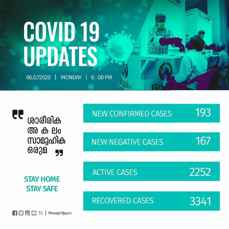 കേരളത്തില് ഇന്ന് 193 പേര്ക്ക് കോവിഡ്-19 സ്ഥിരീകരിച്ചു. മലപ്പുറം ജില്ലയില് നിന്നുള്ള 35 പേര്ക്കും, പത്തനംതിട്ട ജില്ലയില് നിന്നുള്ള 26 പേര്ക്കും, എറണാകുളം ജില്ലയില് നിന്നുള്ള 25 പേര്ക്കും, ആലപ്പുഴ, കോഴിക്കോട് ജില്ലകളില് നിന്നുള്ള 15 പേര്ക്ക് വീതവും, തൃശൂര് ജില്ലയില് നിന്നുള്ള 14 പേര്ക്കും, കൊല്ലം, കണ്ണൂര് ജില്ലകളില് നിന്നുള്ള 11 പേര്ക്ക് വീതവും, പാലക്കാട്, വയനാട് ജില്ലകളില് നിന്നുള്ള 8 പേര്ക്ക് വീതവും, തിരുവനന്തപുരം ജില്ലയില് നിന്നുള്ള 7 പേര്ക്കും, കോട്ടയം, ഇടുക്കി, കാസര്ഗോഡ് ജില്ലകളില് നിന്നുള്ള 6 പേര്ക്ക് വീതവുമാണ് ഇന്ന് രോഗ ബാധ സ്ഥിരീകരിച്ചത്.